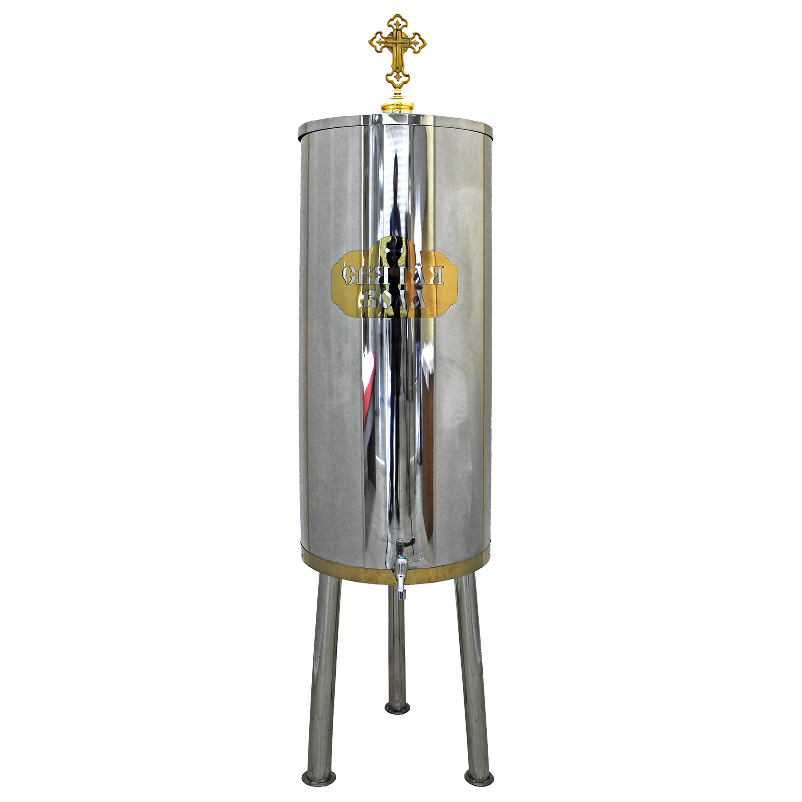 Бак для святой воды имеет вместимость 150 л. Сосуд изготовлен из пищевой нержавеющей стали. Материал обладает антикоррозийными свойствами и имеет зеркальную поверхность. Краник расположен рядом с днищем. Присутствуют дополнительные детали в позолоченных тонах: надпись «Святая вода» по центру, православный крест с распятием в верхней части и металлическая накладка по нижнему краю. Конструкция удерживается на трех ножках с наконечниками.