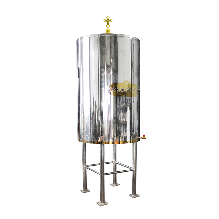 Бак для святой воды имеет вместимость 250 л. Сосуд изготовлен из пищевой нержавеющей стали. Материал обладает антикоррозийными свойствами и имеет зеркальную поверхность. Бак стоит на прочной четырехконечной основе. Несколько кранов расположены рядом с днищем. Присутствуют дополнительные детали в позолоченных тонах: надпись «Святая вода» по центру, православный крест с распятием в верхней части и металлическая накладка по нижнему краю.