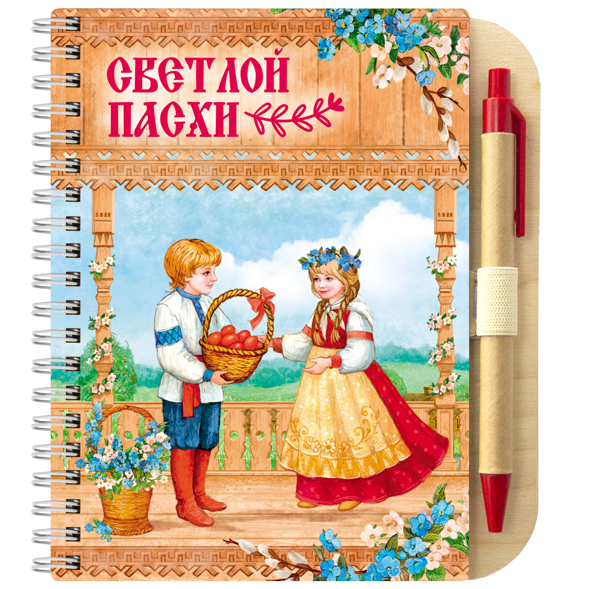 Блокнот деревянный с ручкой "Светлой Пасхи. Мальчик с девочкой", на пружине, 170х125 мм