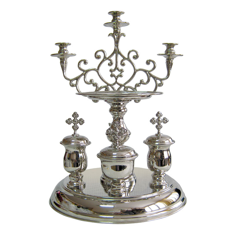 Производственные мастерские «Колокол» предлагают блюдо для всенощного бдения, изготовленное из латуни с никелевым покрытием. Традиционно богатое декорирование литийного прибора в этом изделии имеет более сдержанную трактовку. Оно проявляется в изящно-витиеватых изгибах листьев подсвечника и блеске безупречно отполированной латуни. Больше различной церковной утвари вы можете найти в нашем интернет-магазине.