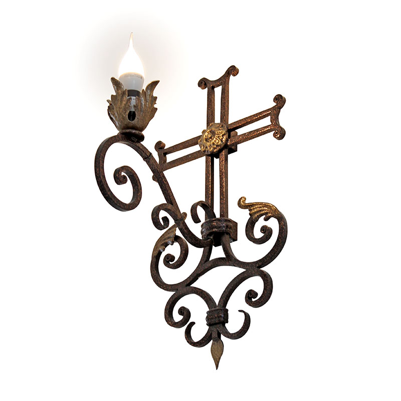 Для создания особой атмосферы молитвенного настроя и приглушенного освещения используются всевозможные бра и светильники. Бра кованое выполнено вручную из прочной и высококачественной стали, не поддающейся коррозии и растрескиванию. Представляет собой однорожковый светильник с креплением на стену в виде креста и держателем для лампы в форме лепестков. Все элементы деталей художественно выкованы и оформлены в виде плавных изгибов с декоративными узорами.