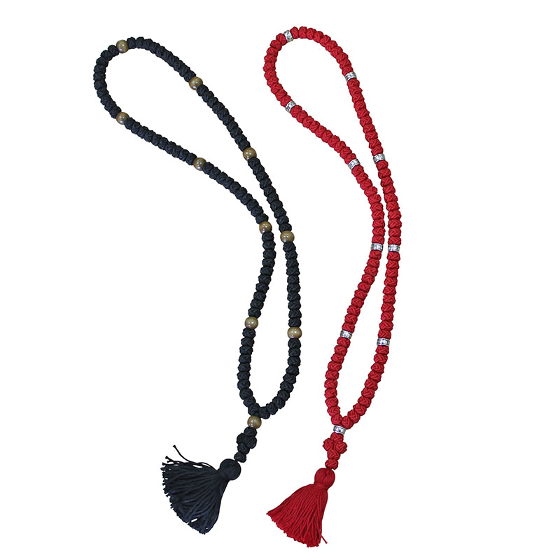 Чётки сутажные ручной работы на 100 узелков. Каждые 10 узелков отделены шариком, диаметр одного зерна — 9 мм.