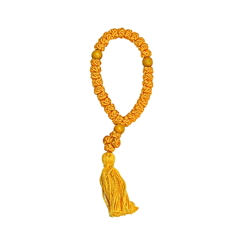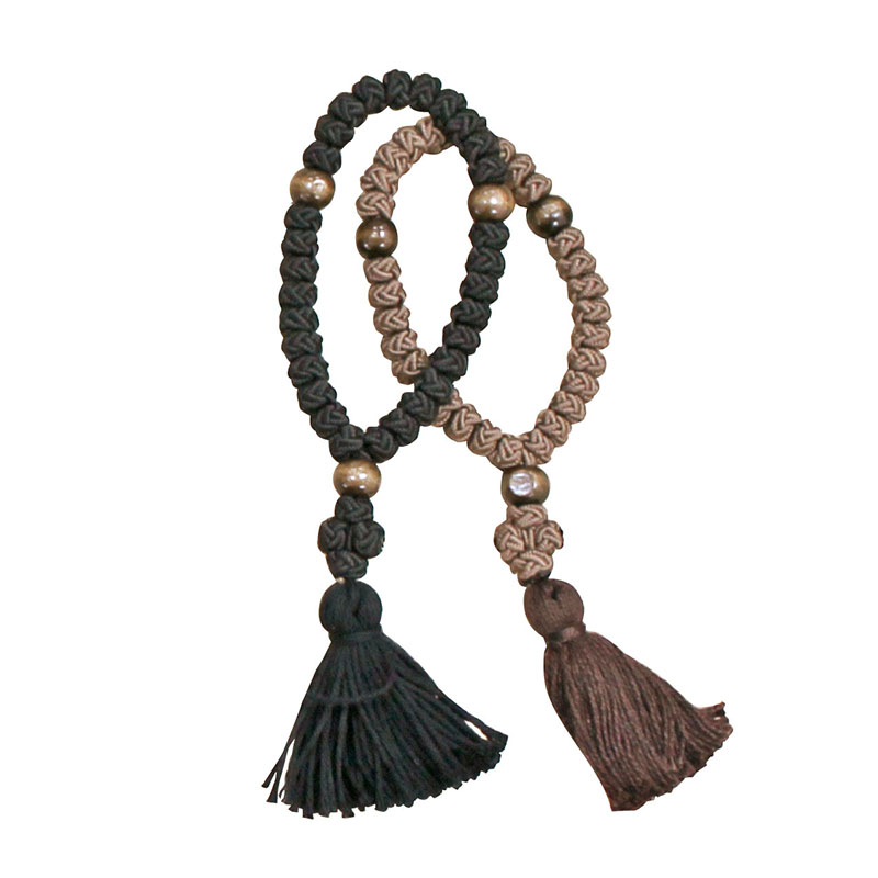 Чётки сутажные ручной работы на 30 узелков. Каждые 10 узелков отделены шариком, диаметр одного зерна — 9 мм.