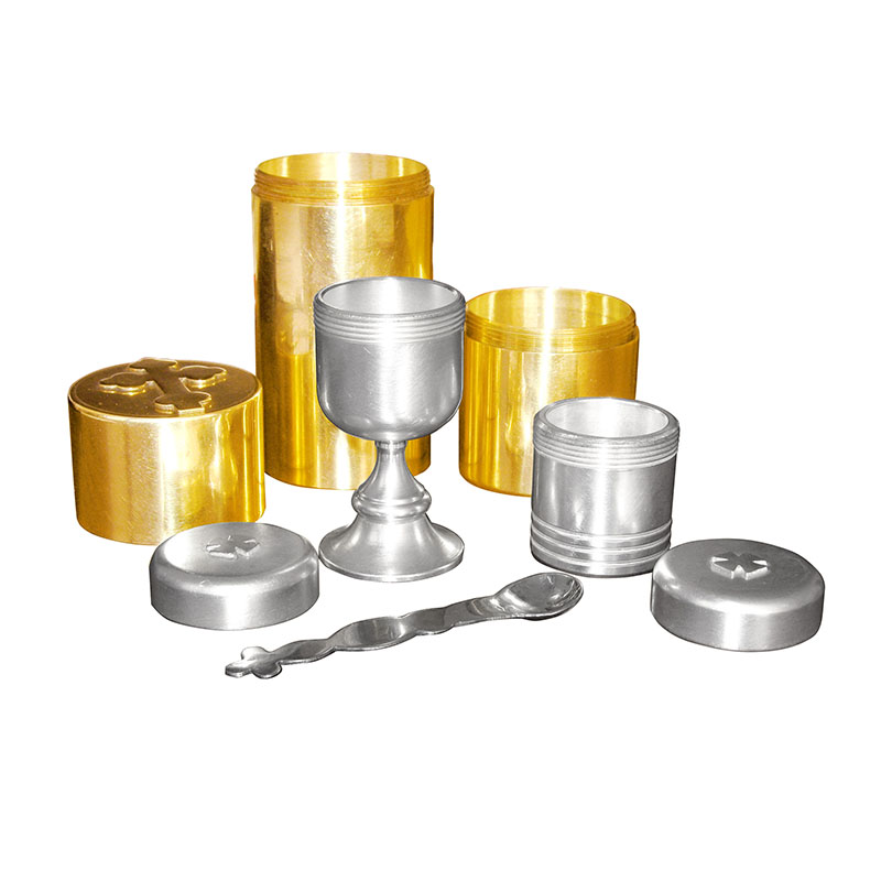 Литургийная чаша (потир) и дароносица для запасных и преждеосвященных Даров снабжены завинчивающимися (резьбовым соединением) крышками. Такие меры предосторожности вызваны особо благоговейным отношением к Телу и Крови Христовой (чтобы в условиях дороги предотвратить малейшую небрежность в отношении к святыне). Мастерские «Колокол» предлагают походный евхаристический набор, изготовленный из латуни. Компактно размещаемые внутри дароносицы небольшие лжица и потир позволят причастить мирян, находящихся по объективным причинам вне храма. Больше различной церковной утвари вы можете найти в нашем интернет-магазине.