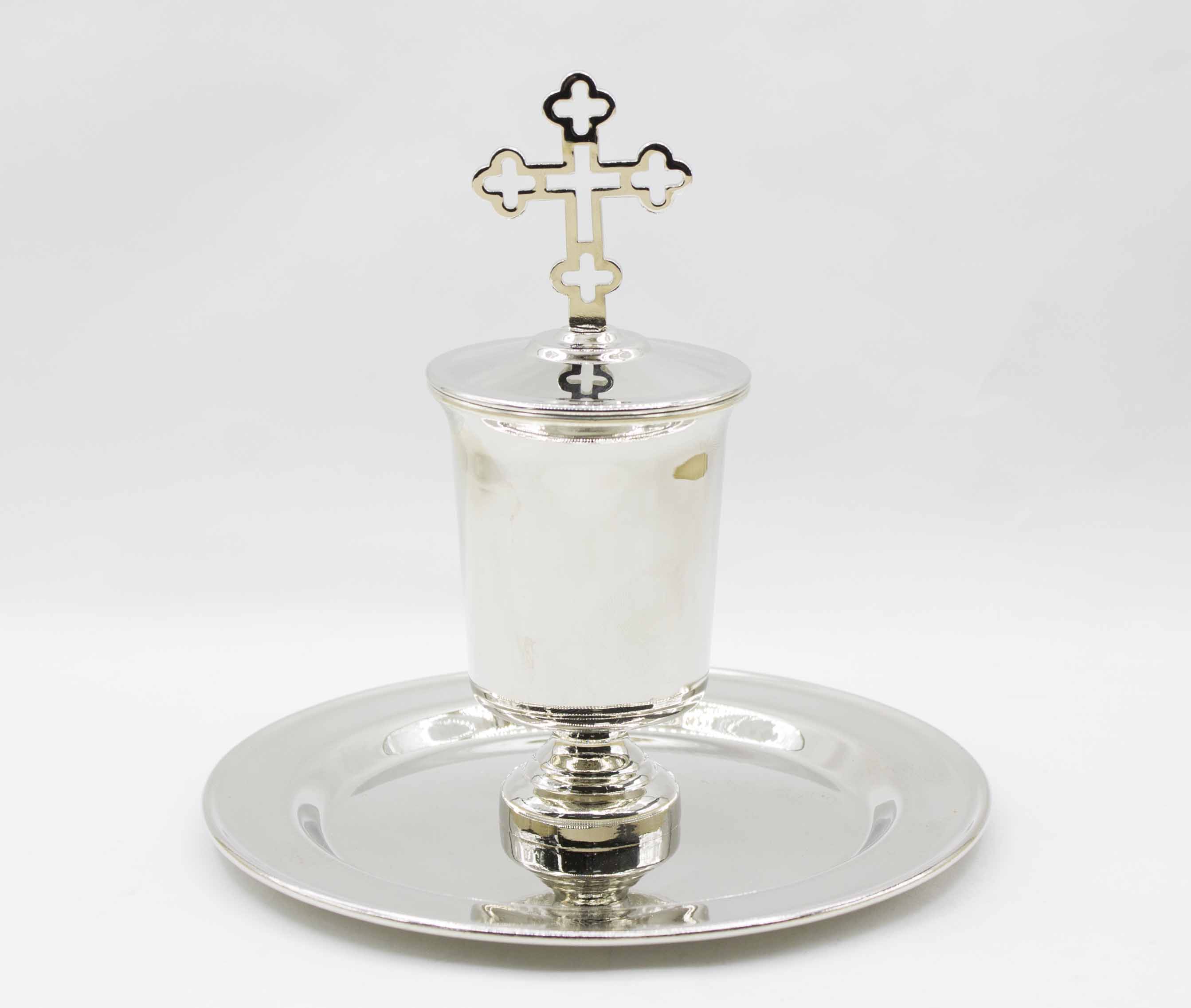 Сосуд предназначен для хранения елея. Имеет плотно закрывающую крышку с крестом. Изготовлен из высококачественных материалов.