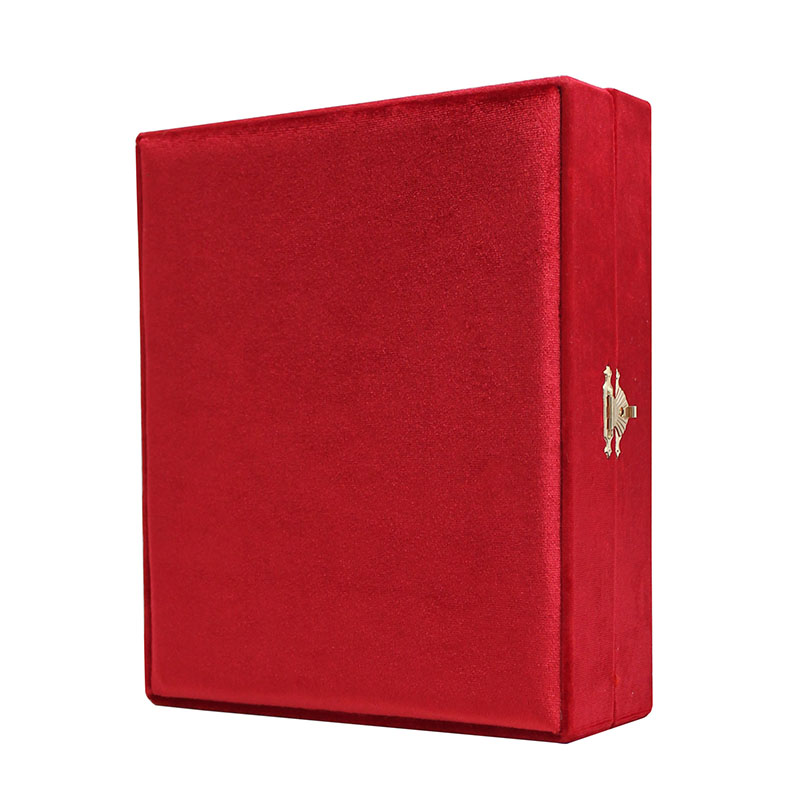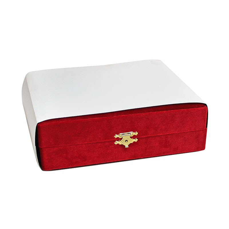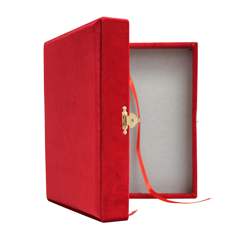Футляр для хранения аналойных икон размером 172 на 208 миллиметра выполнен из бархата благородного красного цвета. Внутренняя часть футляра отделана материалом бежевого цвета. Коробочка для аналойных икон открывается по принципу книжки, внутри имеется атласная алая ленточка. Изделие закрывается с помощью изящной застежки из металла золотого цвета. Форма застежки напоминает стилизованное изображение раскрытой книги.