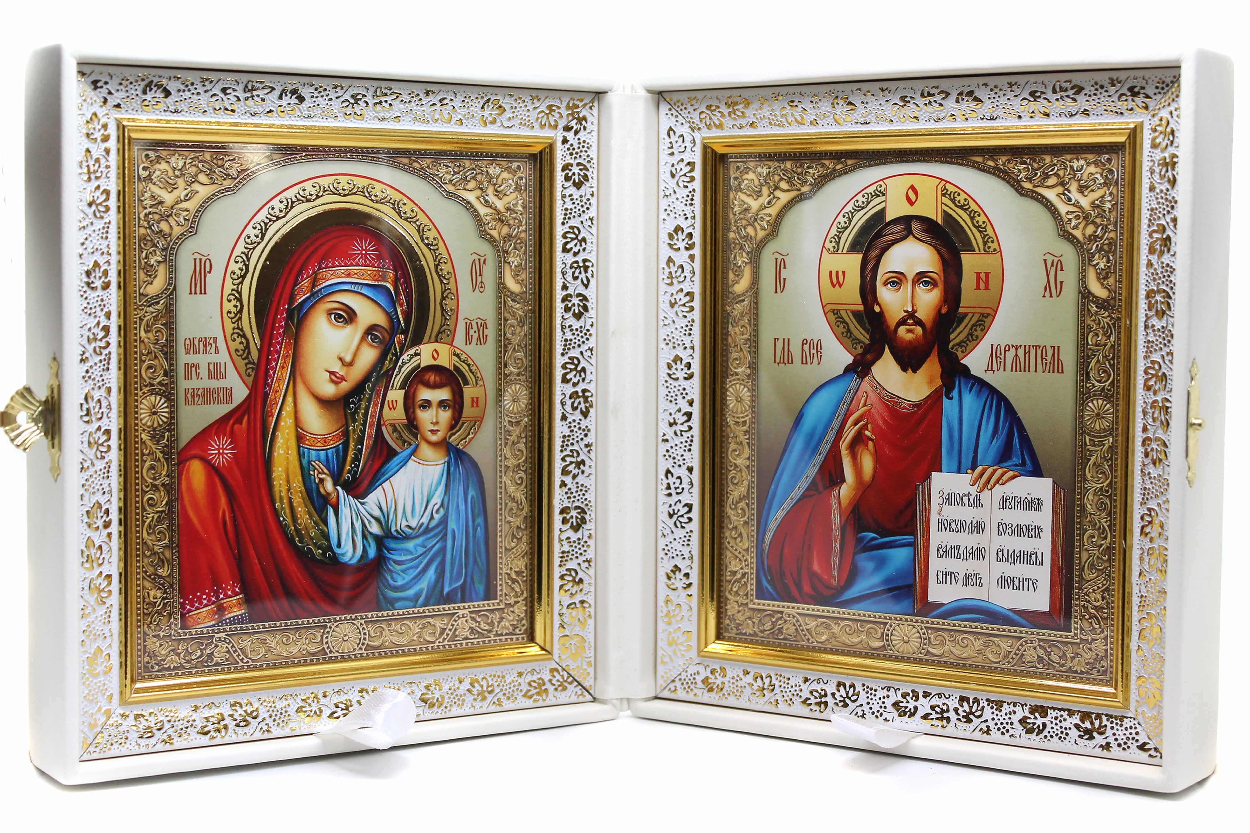 Складень изготовлен из белой мягкой экокожи, крест вышит золотыми нитями. Иконы имеют язычёк, потянув за который Вы сможете достать отдельно каждую икону. Размер складня в сложенном виде: длина 18,5 см, ширина 16 см, высота 6 см.