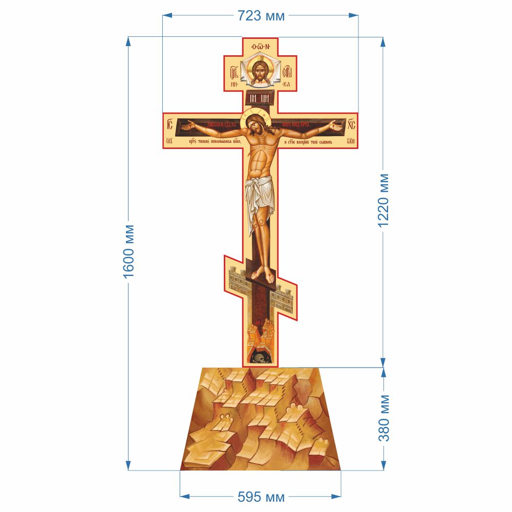 Материал исполнения креста срощенная сосна, окрашивается в темный либо светлый цвет (3 слоя). Изображение печатается на натуральном холсте. Подставка каркасная, фанера 9мм, печать на натуральном холсте. Используются качественные немецкие клеи и лаки.