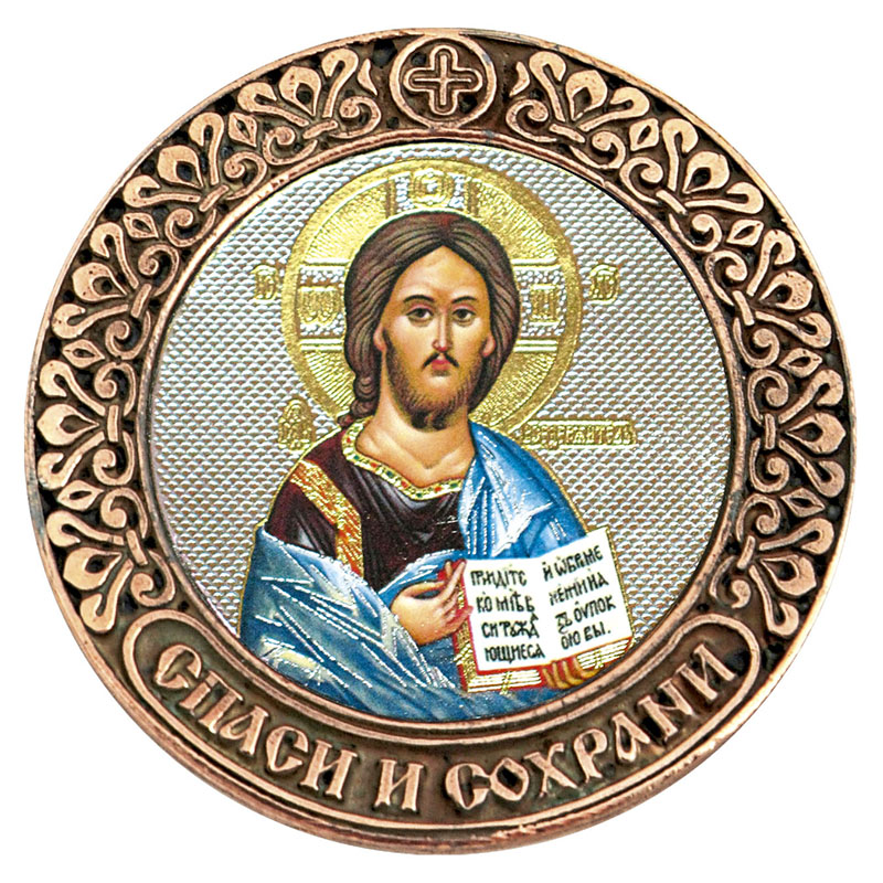 Икона а/м круглая литье (Г.Вседержитель)поясная(скотч) медь