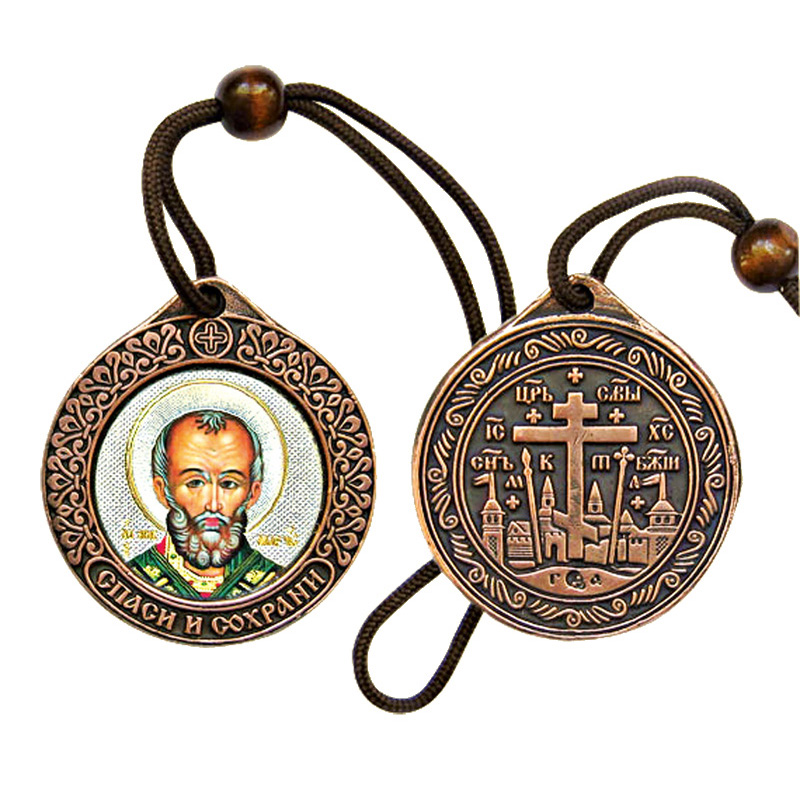 Икона а/м круглая литье (Свт.Николай) (шнур)(медь)