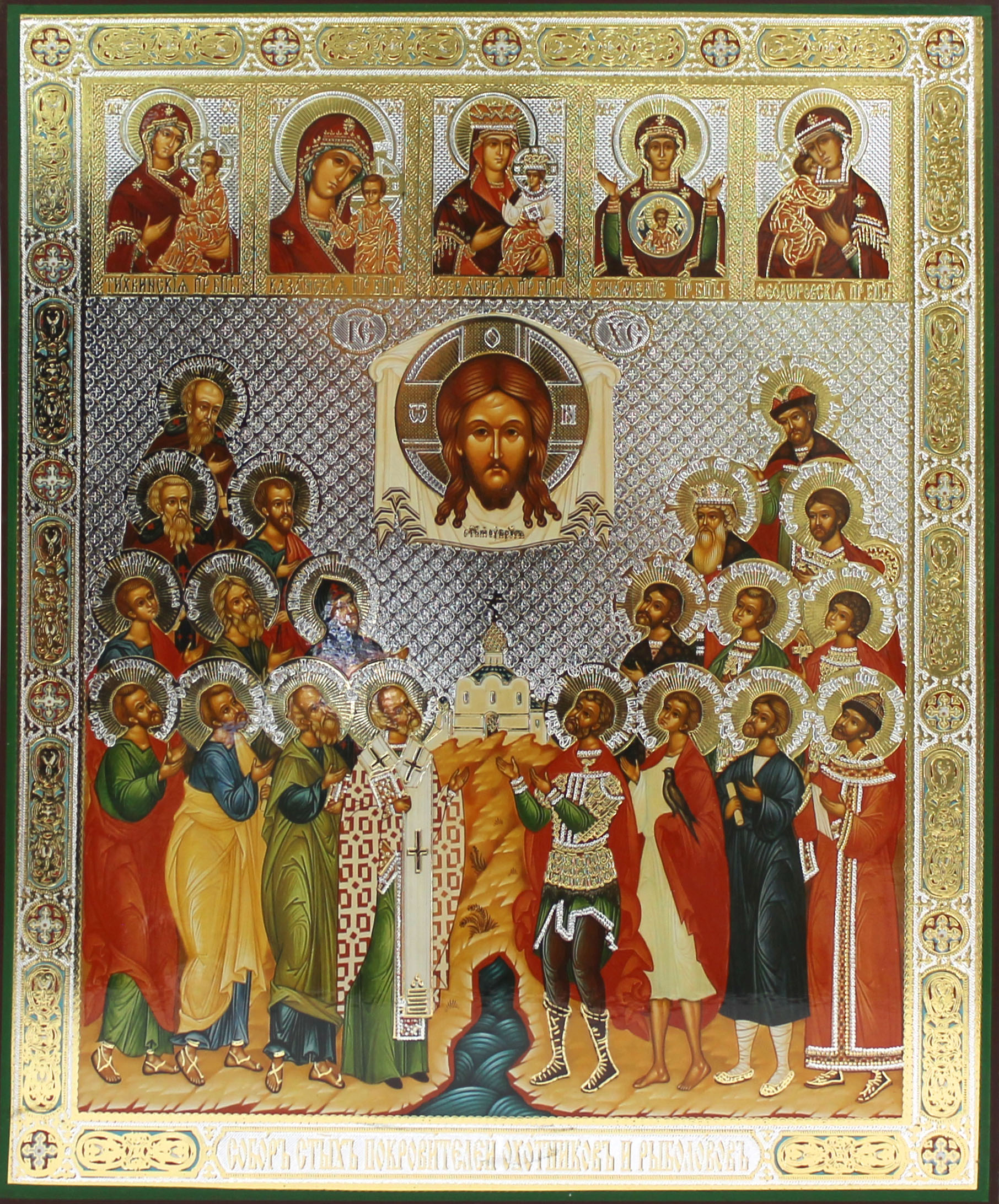 Икона аналойная большая Собор свв. покровителей охотников и рыболовов АБ 019 (242*293)