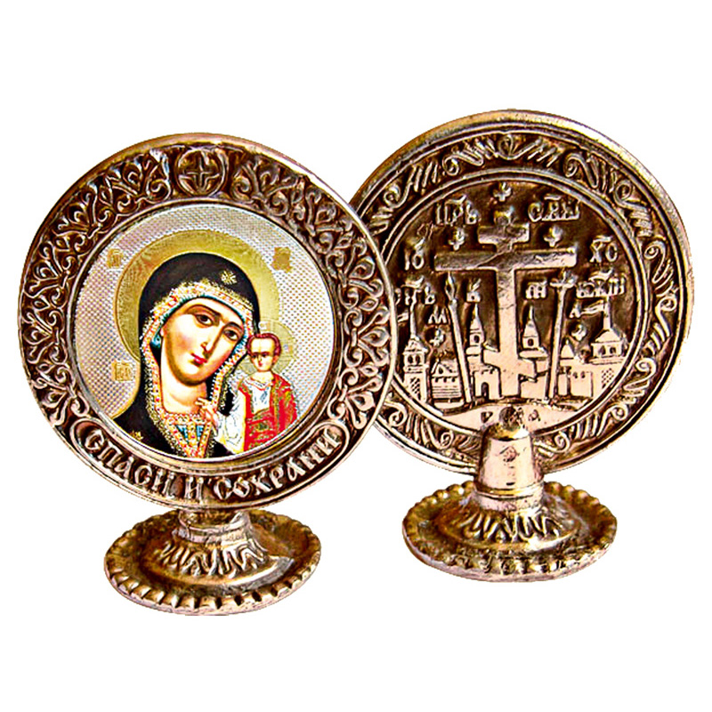 Икона круглая литье на подставке Б.М.Казанская (поясная, золотой нимб) медь