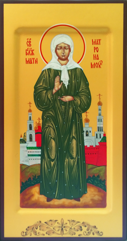 Икона рукописная "Св. блж. Матрона Московская" на дереве (зеленое облачение) (255*130)