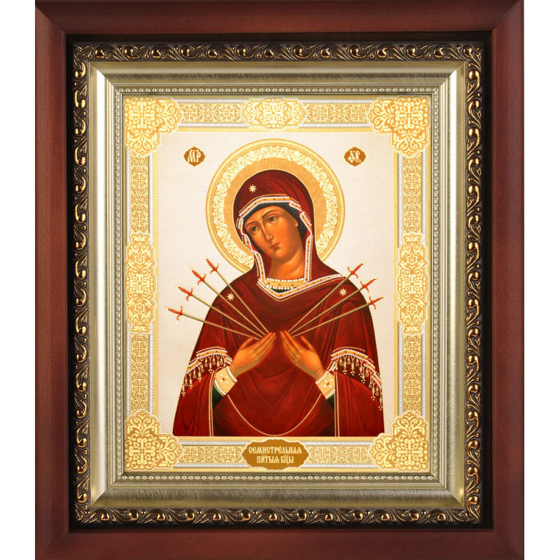 Икона Божьей Матери «Семистрельная» верно и прочно займет свое достойное место в домашнем иконостасе, будет прекрасным подарком для близких на любое торжество. Изображение выдержано в полном соответствии с установленными канонами Церкви. Киот с багетом надежно защитит изделие от внешних воздействий. Будучи ответственным и добросовестным изготовителем, мастерские «Колокол» гарантируют высокое качество продукции, ее адекватно-невысокую стоимость и надежный уровень сервисных услуг. Больше различных икон и товаров вы можете найти в нашем интернет-магазине.