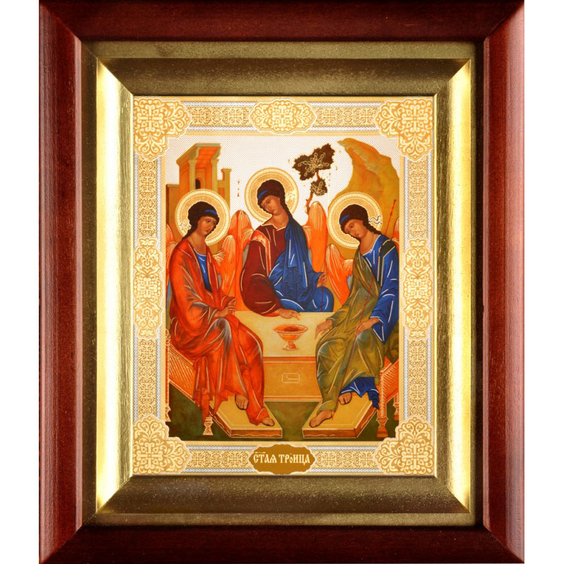 Образ «Пресвятой Троицы» (копия шедевра Рублева) - вершина русской иконописи. Написанный с использованием обратной перспективы (передний план мелок и незначителен, а дальний «горний мир» велик и впечатляющ), этот образ соответствует строгим канонам иконографии. На иконе «Пресвятой Троицы» (ее чествование – 50-й день по Пасхе) изображены три безмятежных ангела, ведущие неторопливую смиренную беседу. Иконописец Андрей Рублев был скуп в изображении деталей: их немного. Но каждый элемент иконы несет великую смысловую нагрузку. Так, чаша есть образ страданий Божьего Сына, Мамврийский дуб с развесистой кроной символизирует древо жизни, гора в правом углу композиции – искупительную Голгофу, а Авраамов дом в левом углу является символом Церкви.Динамично развивающиеся производственные мастерские «Колокол» с любовью к Богу и людям предлагают церковную утварь различного назначения, в том числе - икону «Пресвятая Троица» в киоте. Деревянный ковчежец со стеклом надежно защитит иконописный образ от неблагоприятного воздействия извне и повреждений различного рода. Будучи ответственным и добросовестным изготовителем, мастерские «Колокол» гарантируют высокое качество продукции, ее адекватно-невысокую стоимость и надежный уровень сервисных услуг. Больше различных икон и товаров вы можете найти в нашем интернет-магазине.