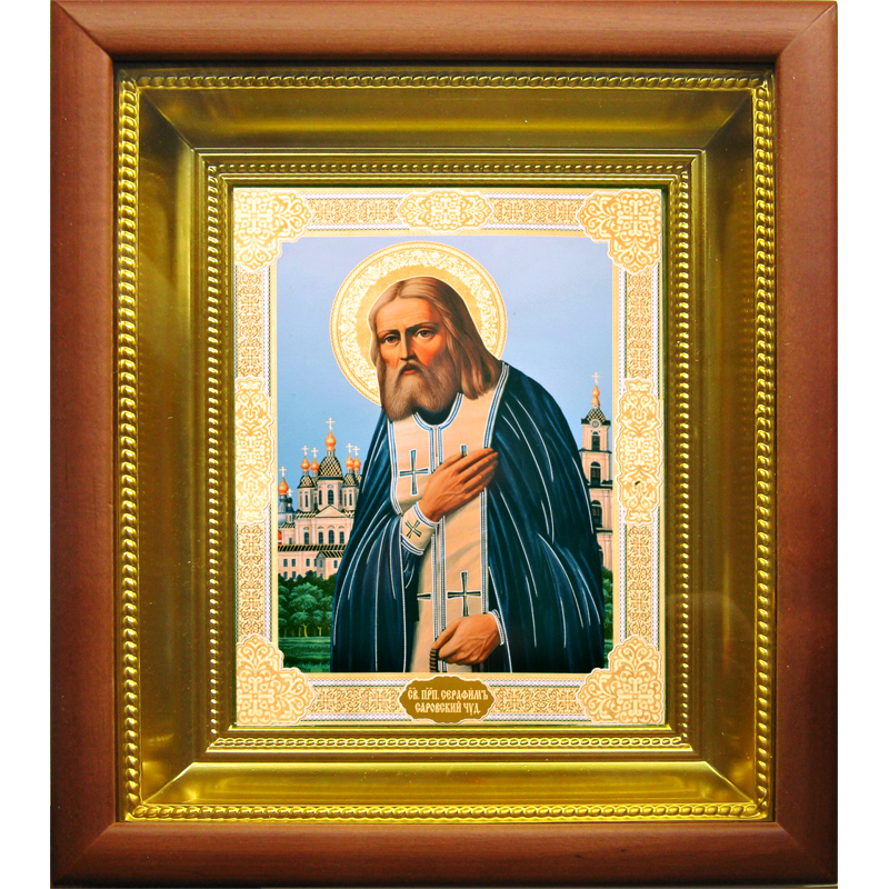 Икона преподобного Серафима Саровского особо почитаема в православии. Этот великий святой подвизался в подвиге столпничества и тысячу ночей провел в молитве, отбивая нападки «врага рода человеческого». Из 16-ти лет, проведенных в пустыне, он три провел в безмолвии, а шесть лет принимал страждущих, утешая и исцеляя их. Народ своего «батюшку Серафима» еще при его жизни почитал за святого и притекал к его заступничеству в тяжелых житейских ситуациях. В каждом православном храме имеется икона преподобного Серафима Саровского. Молясь пред нею, верующие получают защиту от искушений/бед/напастей, разрешение проблем, укрепление в вере. Преподобный Серафим Саровский и сегодня помогает выстоять в борьбе с наитяжкими грехами - унынием и скорбью. Днями памяти святого установлены 1 августа и 15 января – дни его рождения и кончины.Динамично развивающиеся производственные мастерские «Колокол» с любовью к Богу и людям предлагают церковную утварь различного назначения, в том числе - икону преподобного Серафима Саровского в киоте с золотым подрамником. Деревянный ковчежец со стеклом надежно защитит иконописный образ от неблагоприятного воздействия извне и повреждений различного рода. Будучи ответственным и добросовестным изготовителем, мастерские «Колокол» гарантируют высокое качество продукции, ее адекватно-невысокую стоимость и надежный уровень сервисных услуг. Больше различных икон и товаров вы можете найти в нашем интернет-магазине.
