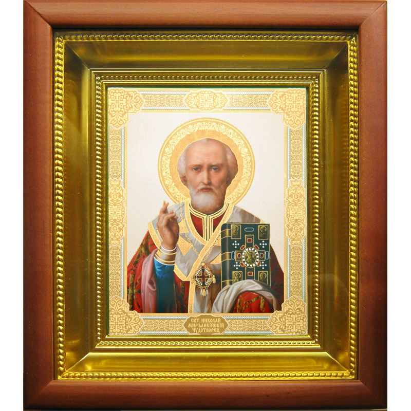 Икона с образом Николая Чудотворца олицетворяет одного из самых любимых и почитаемых святых на Руси. Святителю Николаю молятся в любых житейских нуждах, он скорый помощник морякам, путешественникам, купцам, несправедливо осужденным и детям. Однако помочь он может всякому, кто искренне откроет свое сердце в молитве. Обращаясь к нему с искренней верой, люди находят утешение в тяжелых жизненных перепятиях. На небольшом образе святой изображен по пояс, в левой руке он держит Святое Писание, а правая рука поднята для благословения. Икона помещена в киот c золотым подрамником, который надежно защитит иконописный образ от неблагоприятного воздействия извне и повреждений различного рода. Дни памяти Николая Чудотворца: 6 (19) декабря — день праведной кончины; 9 (22) мая — день прибытия мощей в город Бари; 29 июля (11 августа) — рождество святого Николая.