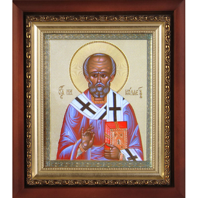 Икона с образом Николая Чудотворца олицетворяет одного из самых любимых и почитаемых святых на Руси. Святителю Николаю молятся в любых житейских нуждах, он скорый помощник морякам, путешественникам, купцам, несправедливо осужденным и детям. Однако помочь он может всякому, кто искренне откроет свое сердце в молитве. Обращаясь к нему с искренней верой, люди находят утешение в тяжелых жизненных перепятиях. На небольшом образе святой изображен по пояс, в левой руке он держит Святое Писание, а правая рука поднята для благословения. Икона помещена в киот, сверху украшена багетом в спокойных тонах. Дни памяти Николая Чудотворца: 6 (19) декабря — день праведной кончины; 9 (22) мая — день прибытия мощей в город Бари; 29 июля (11 августа) — рождество святого Николая.