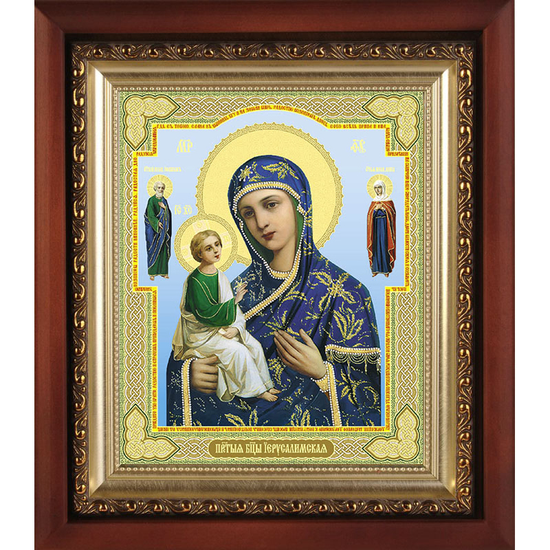 Богородичный образ «Иерусалимская» - икона, по преданию написанная в Гефсимании на 15-й год по Вознесению Спасителя апостолом Лукой. Представляя собой иконографический тип «Путеводительница»/«Одигитрия», этот образ (со вписанными фигурами родителей Богородицы Иоакима и Анны) имеет богатую историю. От времени создания «Иерусалимская» пребывала в Константинополе, Херсонесе, Киеве, Новгороде, Москве, и наконец в Париже, откуда и поныне источает на верующих свою любовь и милость. Пред этим образом молятся о защите при вражьих нападениях и стихийных бедствиях, об избавлении от недугов глаз и паралича. В России находится несколько списков «Иерусалимской», день чествования которой припадает на 12 октября.Динамично развивающиеся производственные мастерские «Колокол» с любовью к Богу и людям предлагают церковную утварь различного назначения, в том числе - икону Божией Матери «Иерусалимская» в киоте с багетом. Деревянный ковчежец со стеклом надежно защитит иконописный образ от неблагоприятного воздействия извне и повреждений различного рода. Будучи ответственным и добросовестным изготовителем, мастерские «Колокол» гарантируют высокое качество продукции, ее адекватно-невысокую стоимость и надежный уровень сервисных услуг. Больше различных икон и товаров вы можете найти в нашем интернет-магазине.