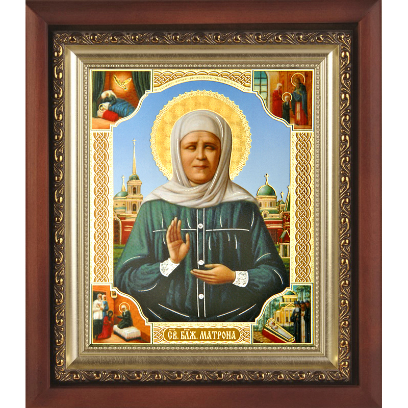 Икона блаженной Матроны Московской – одна из наиболее почитаемых на Руси. Став известной еще при жизни (1881-1952) как подвижница во Славу Божью и крепкая за людей молитвенница, Матронушка прожила жизнь, полную духовного подвига, любви, самоотречения. По ее молитвам и в ХХІ веке продолжают свершаться чудеса, а многотысячный людской поток для поклонения мощам не иссякает по нескольку часов. При жизни святая обещала услышать и помочь в житейских нуждах всем, кто к ней обратится. Поэтому в каждом храме обязательно есть икона блаженной Матроны, горячая молитва перед которой творит настоящие чудеса. Дни ее памяти: 22.11 (рождение), 8.03 (обретение мощей), 2.05 (кончина).Динамично развивающиеся производственные мастерские «Колокол» с любовью к Богу и людям предлагают церковную утварь различного назначения, в том числе - икону блаженной Матроны Московской с житием в киоте с багетом. Деревянный ковчежец со стеклом надежно защитит иконописный образ от неблагоприятного воздействия извне и повреждений различного рода. Будучи ответственным и добросовестным изготовителем, мастерские «Колокол» гарантируют высокое качество продукции, ее адекватно-невысокую стоимость и надежный уровень сервисных услуг. Больше различных икон и товаров вы можете найти в нашем интернет-магазине.