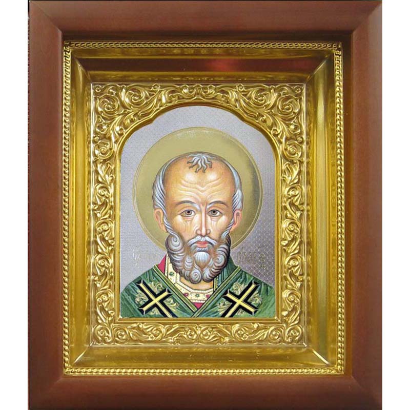 Икона с образом Николая Чудотворца олицетворяет одного из самых любимых и почитаемых святых на Руси. Святителю Николаю молятся в любых житейских нуждах, он скорый помощник морякам, путешественникам, купцам, несправедливо осужденным и детям. Однако помочь он может всякому, кто искренне откроет свое сердце в молитве. Обращаясь к нему с искренней верой, люди находят утешение в тяжелых жизненных перепятиях. На небольшом образе святой изображен по пояс, в левой руке он держит Святое Писание, а правая рука поднята для благословения. Икона помещена в киот с ризой, который надежно защитит иконописный образ от неблагоприятного воздействия извне и повреждений различного рода. Дни памяти Николая Чудотворца: 6 (19) декабря — день праведной кончины; 9 (22) мая — день прибытия мощей в город Бари; 29 июля (11 августа) — рождество святого Николая.