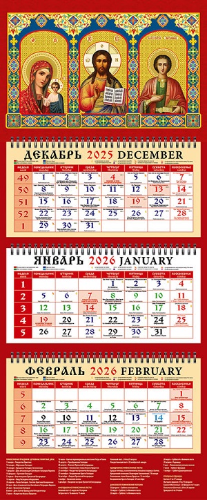 Календарь квартальный на 2026 г."Господь Вседержитель,ПБ Казанская,Пантелеймон",трехблочный (22606)