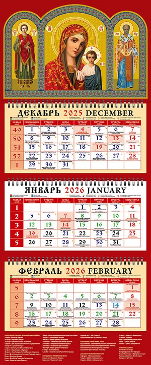 Календарь квартальный на 2026 г."ПБ Казанская,св.мч.Пантелеймон, свт.Николай.",трехблочный (22604)