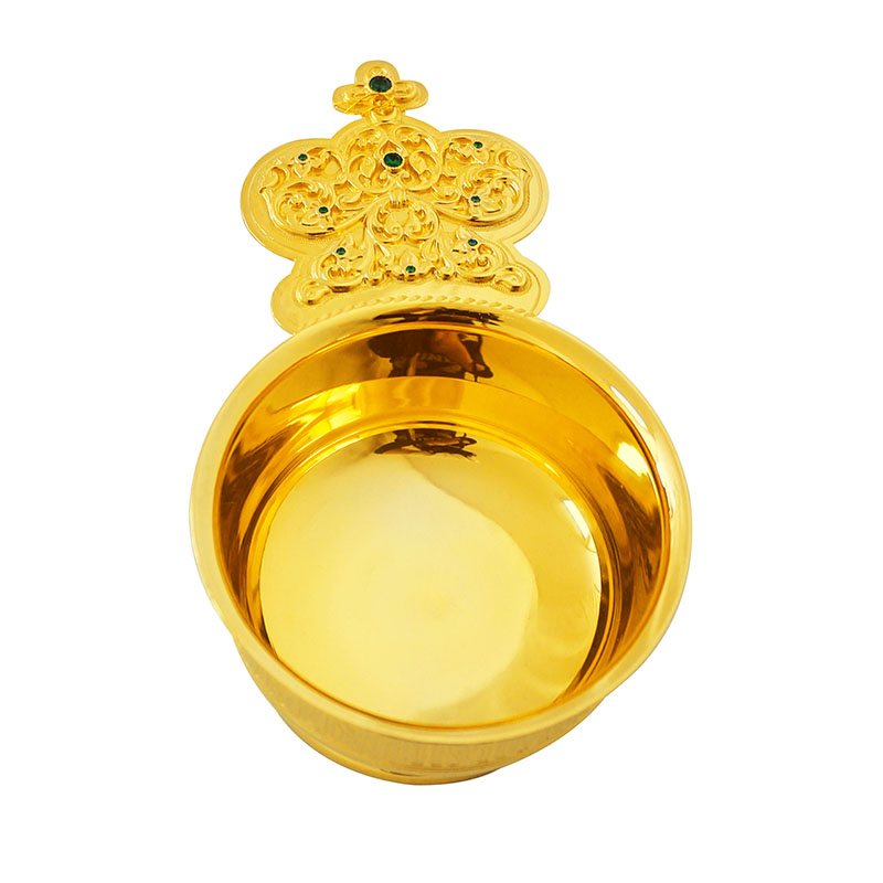 Предлагаемый производственными мастерскими «Колокол» ковш для теплоты выполнен из качественно позолоченной латуни с соблюдением традиций, обязательных при изготовлении богослужебной утвари. На внешней стороне ковша выгравировано: «Теплота веры исполни Духа Святого». Его ручка имеет обязательные очертания богато декорированной короны и венчается изображением в форме креста. Воспользовавшись каталогом «Колокола», приобретите церковную утварь эталонного качества по адекватно-невысокой стоимости.