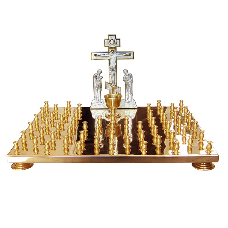 Производственные мастерские "Колокол" предлагают храмам крышки для панихидных столиков различных размеров. Наиболее востребованной позицией является поминальный подсвечник на 60 свечей размером 555x485 мм с Голгофой и лампадкой. Относясь к среднему габаритному сегменту, такая конструкция - оптимальное решение для храма. Крышка панихидного стола изготавливается из латуни. Качественный сплав меди-цинка обладает отменными эстетическими и эксплуатационными характеристиками. Данное изделие на долгие годы станет пристанищем для поминальных свеч, олицетворяющих силу христианской любви к ушедшим на небо душам близких людей.