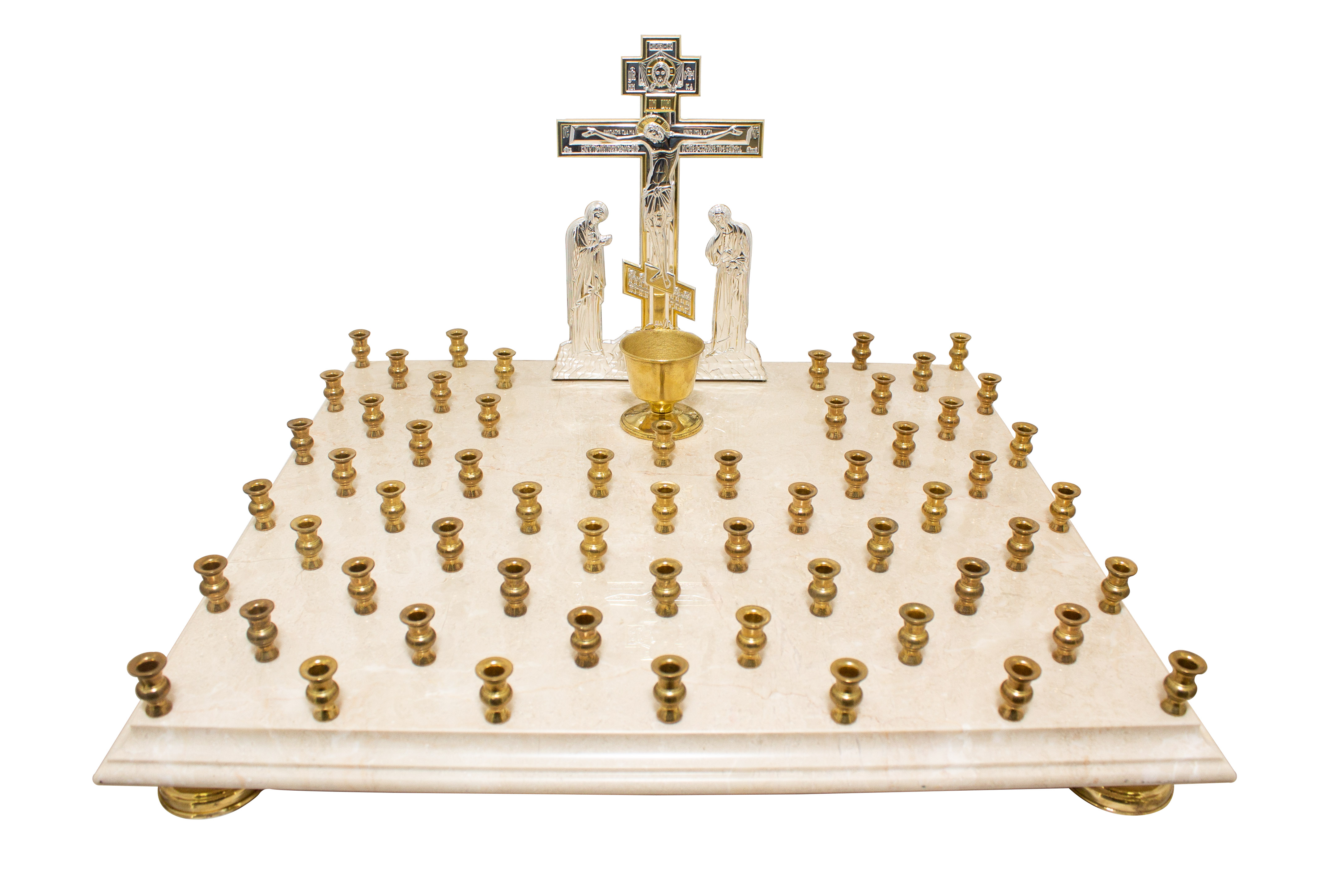 Производственные мастерские "Колокол" предлагают храмам крышки для панихидных столиков различных размеров. Наиболее востребованной позицией является поминальный подсвечник на 60 свечей размером 555x485 мм с Голгофой и лампадкой. Относясь к среднему габаритному сегменту, такая конструкция - оптимальное решение для храма. Изготовливается данное изделие из мрамора. Мрамор - это долговечный, стойкий к перепадам температуры и влажности материал, который при должном уходе сохранит свой великолепный вид на многие десятилетия. Крышка панихидного стола (еще называемая канунником, кануном) на долгие годы станет пристанищем для поминальных свеч, олицетворяющих силу христианской любви к ушедшим на небо душам близких людей.