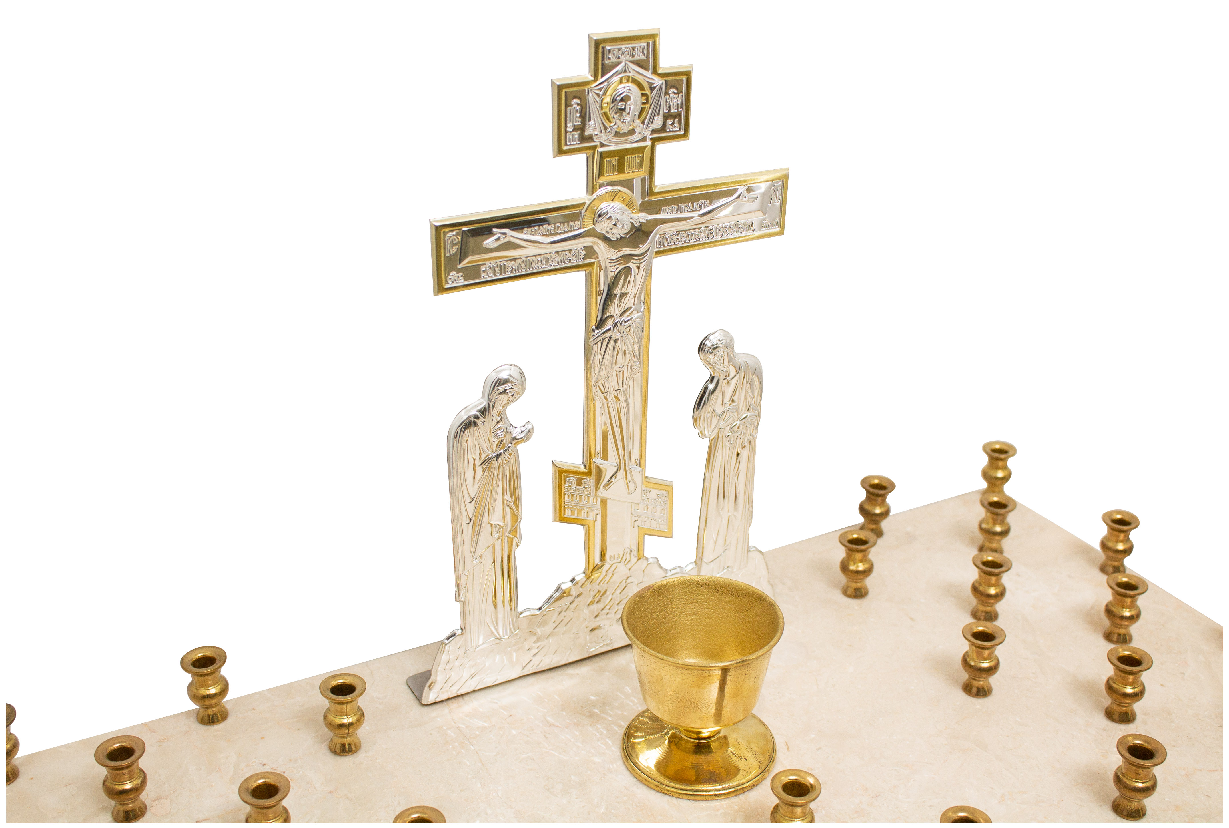 Производственные мастерские "Колокол" предлагают храмам крышки для панихидных столиков различных размеров. Наиболее востребованной позицией является поминальный подсвечник на 60 свечей размером 555x485 мм с Голгофой и лампадкой. Относясь к среднему габаритному сегменту, такая конструкция - оптимальное решение для храма. Изготовливается данное изделие из мрамора. Мрамор - это долговечный, стойкий к перепадам температуры и влажности материал, который при должном уходе сохранит свой великолепный вид на многие десятилетия. Крышка панихидного стола (еще называемая канунником, кануном) на долгие годы станет пристанищем для поминальных свеч, олицетворяющих силу христианской любви к ушедшим на небо душам близких людей.