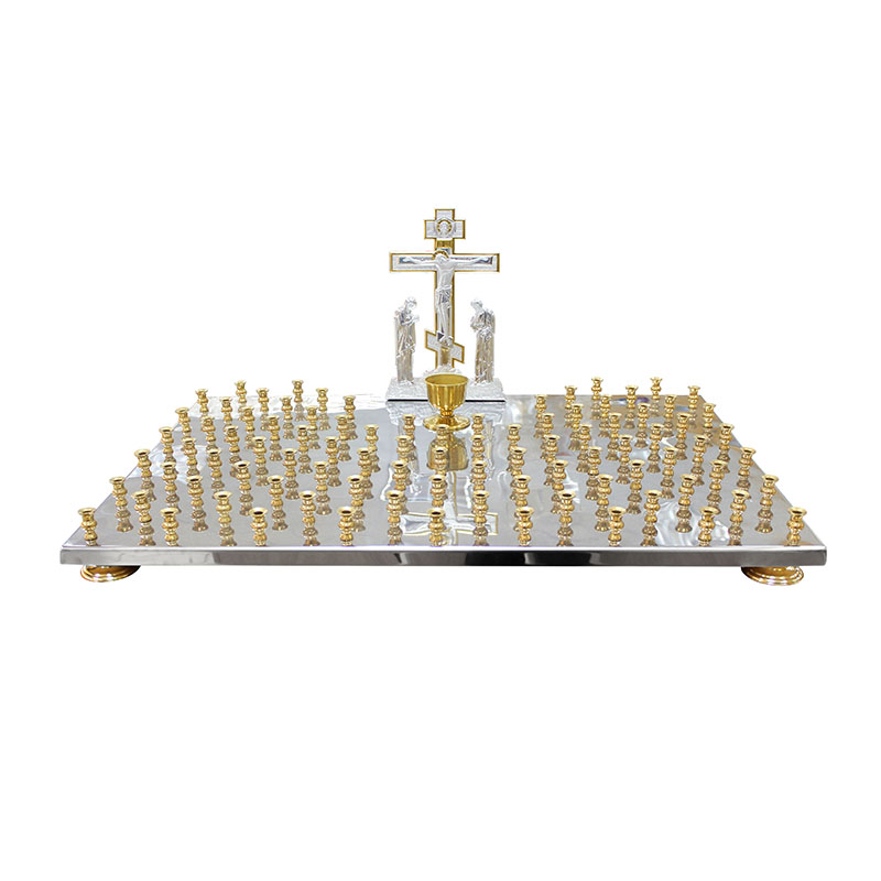 Производственные мастерские "Колокол" предлагают храмам крышки для панихидных столиков различных размеров. Одна из востребованных позиций - поминальный подсвечник на 90 свечей размером 750x520 мм с Голгофой и лампадкой. Относясь к среднему габаритному сегменту, такая конструкция - оптимальное решение для храма. Изготовленная из нержавеющей стали, которой не страшна коррозия, крышка панихидного стола (еще называемая канунником, кануном) на долгие годы станет пристанищем для поминальных свеч, олицетворяющих силу христианской любви к ушедшим на небо душам близких людей.