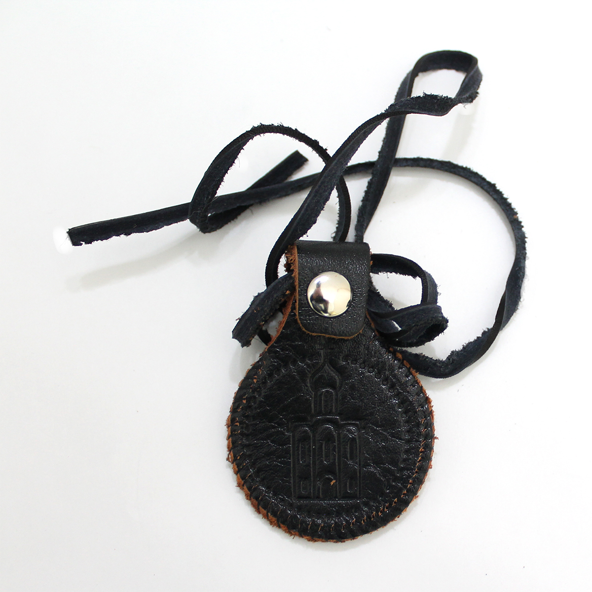 Ладанка с кнопкой на кож. шнурке с тисн. молитв и симв. круг, 45*60 мм, кожа
