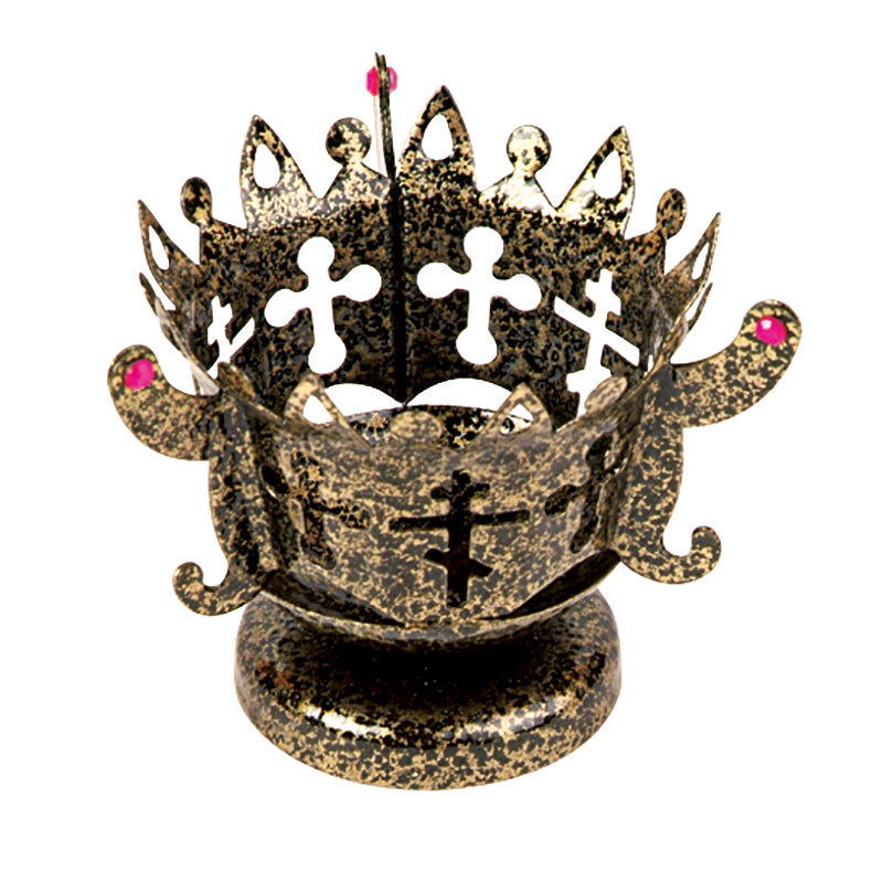Настольный подлампадник "Лилия" — металлическое изделие круглой формы бронзового цвета с полимерным покрытием. Это качественный товар с приятным внешним видом. На металлическом каркасе по кругу находятся сквозные изображения православного креста. Присутствуют дополнительные мелкие детали, фигурное оформление верхней части в виде короны. Изделие имеет высоту 55 мм и внутренний диаметр 70 мм.