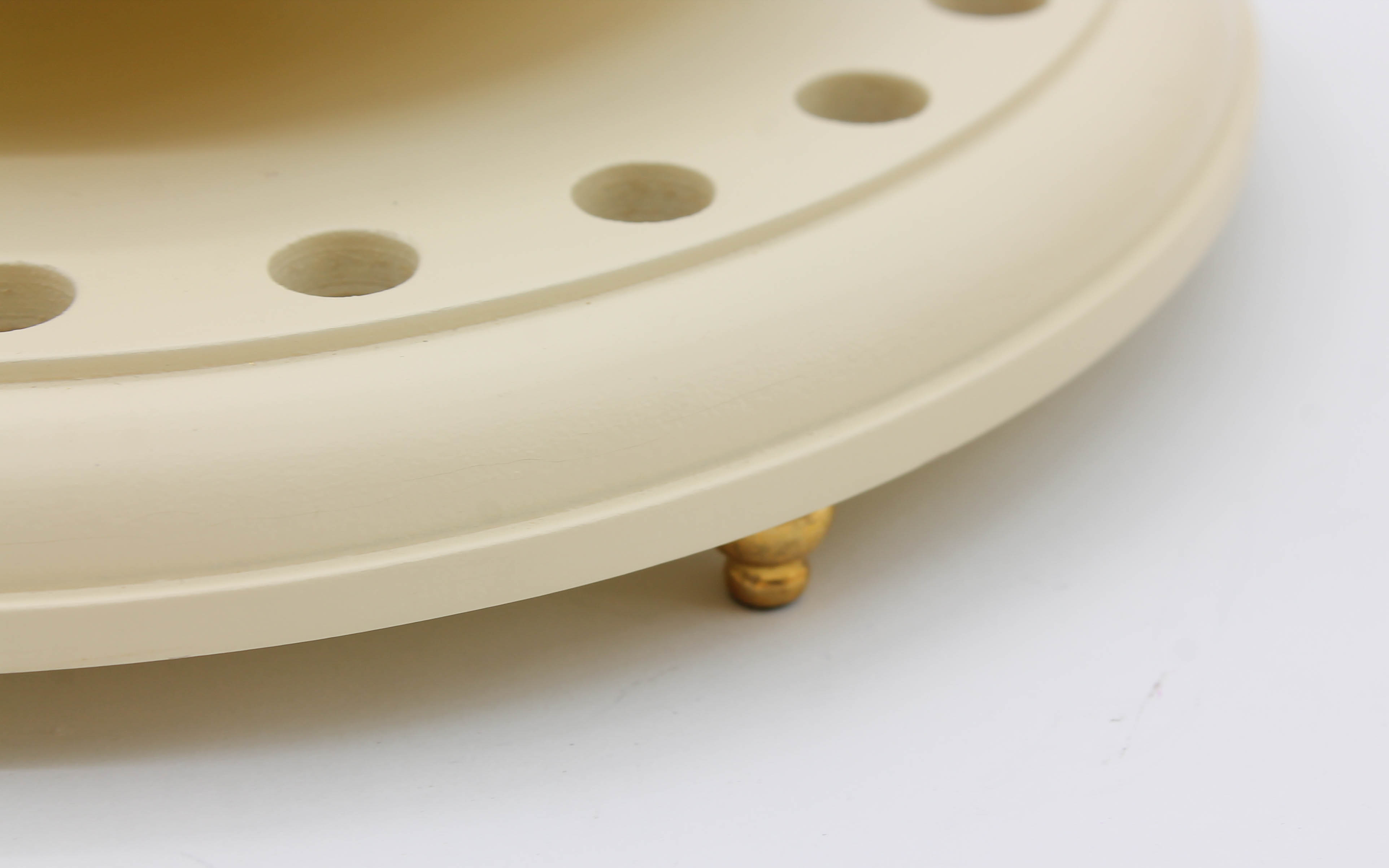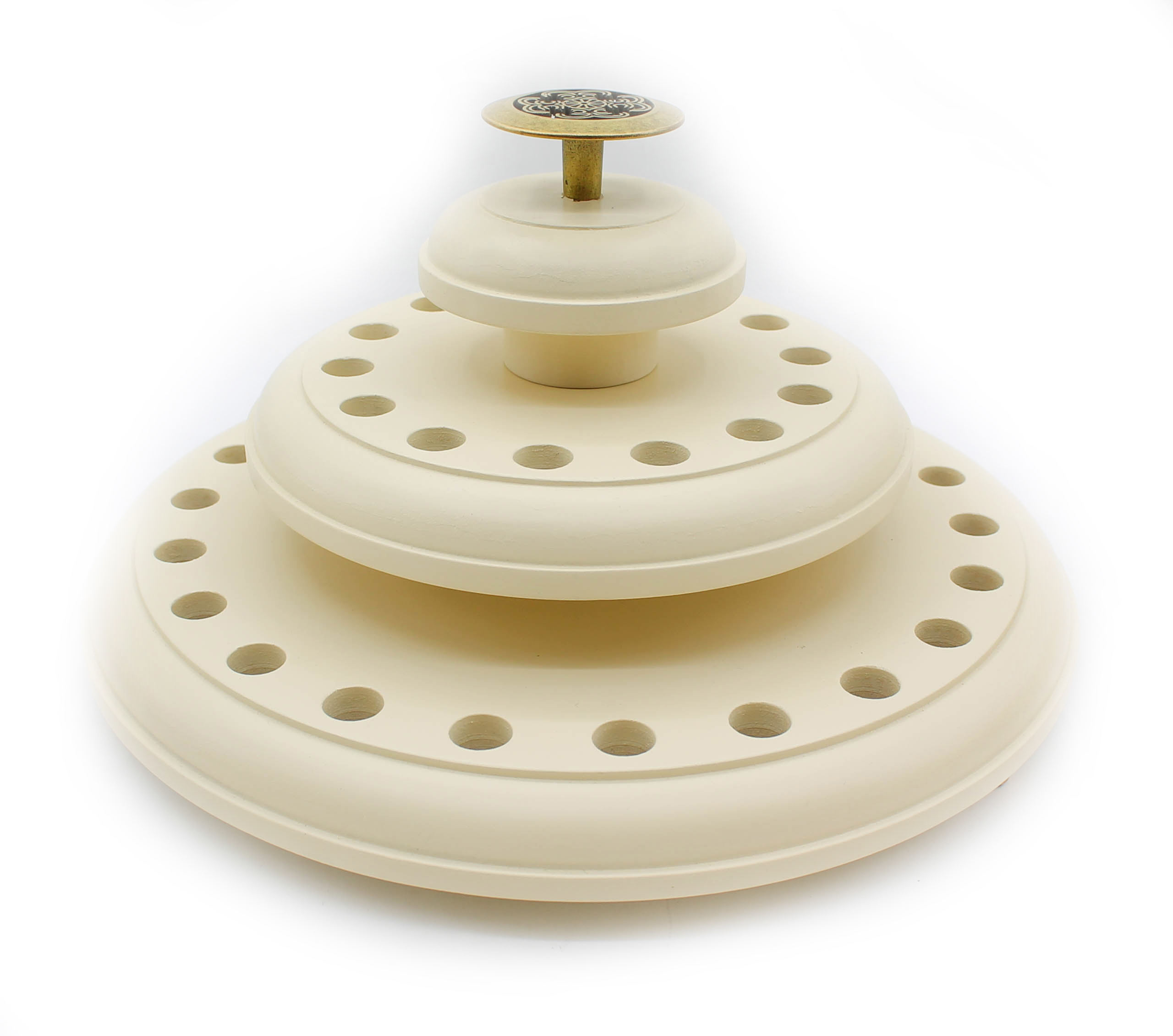 Для удобства в использовании церковных благовоний в храмах и в быту производственная мастерская «Колокол» предлагает вашему вниманию подставку под благования. Круглая двухъярусная основа из дерева прочной породы диаметром 20 см. и высотой 11 см. не только гармонично впишется в дизайн церкви или дома, но и позволит вместить в себя достаточно большое количество сосудов с благовониями емкостью по 1,5 мл. Утварь имеет приятный светлый оттенок, ножки основания выполнены из металла, окрашены под цвет золота и придают подставке изящность и легкий блеск.