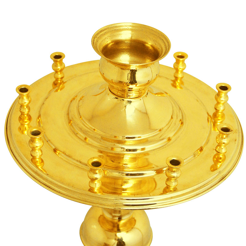 Материал, из которого изготовлен подсвечник детский, - латунь. Это практичный и красивый металл, состоящий из сплава меди и цинка, с золотым блеском, удобный в уходе. Подставка для свечей имеет 9 лунок, чашу для лампадки. Поднос для свечей установлен на витой ножке с шарообразными украшениями сверху и снизу, напольная опора устойчиво закреплена на трех ножках.