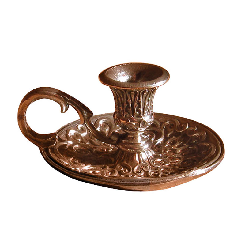 Небольшой и аккуратный подсвечник "Домашний маленький" для установки и равномерного горения церковной свечи дома. Изготовлен с помощью отливки изделия из свинца с последующей гальваникой меди, устойчивой к высоким температурам и процессу коррозии. Выполнена в виде неглубокой чаши-держателя для свечи с круглым основанием и дугообразной ручкой. Утварь со всех сторон декорирована витыми узорами. Высота подсвечника - 30 мм.