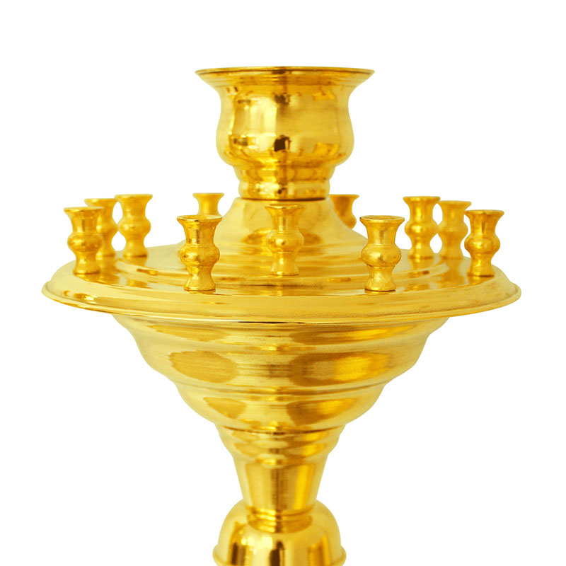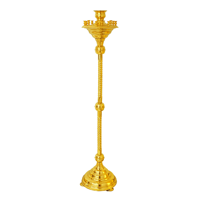 Производственные мастерские «Колокол» предлагают латунный подсвечник с лампадкой на 12 свечей. Качественный сплав меди-цинка обладает отменными эстетическими и эксплуатационными характеристиками. Безупречный вид изделия, выполненного на декоративно-витой опоре («ноге»), не только исполнит роль функциональной подставки для свеч, но станет украшением храма. Высота изделия составляет 120 см, высота опоры - 85 см, вехний диаметр подсвечника 24 см, нижний - 26 см.Вес - 4,3 кг.