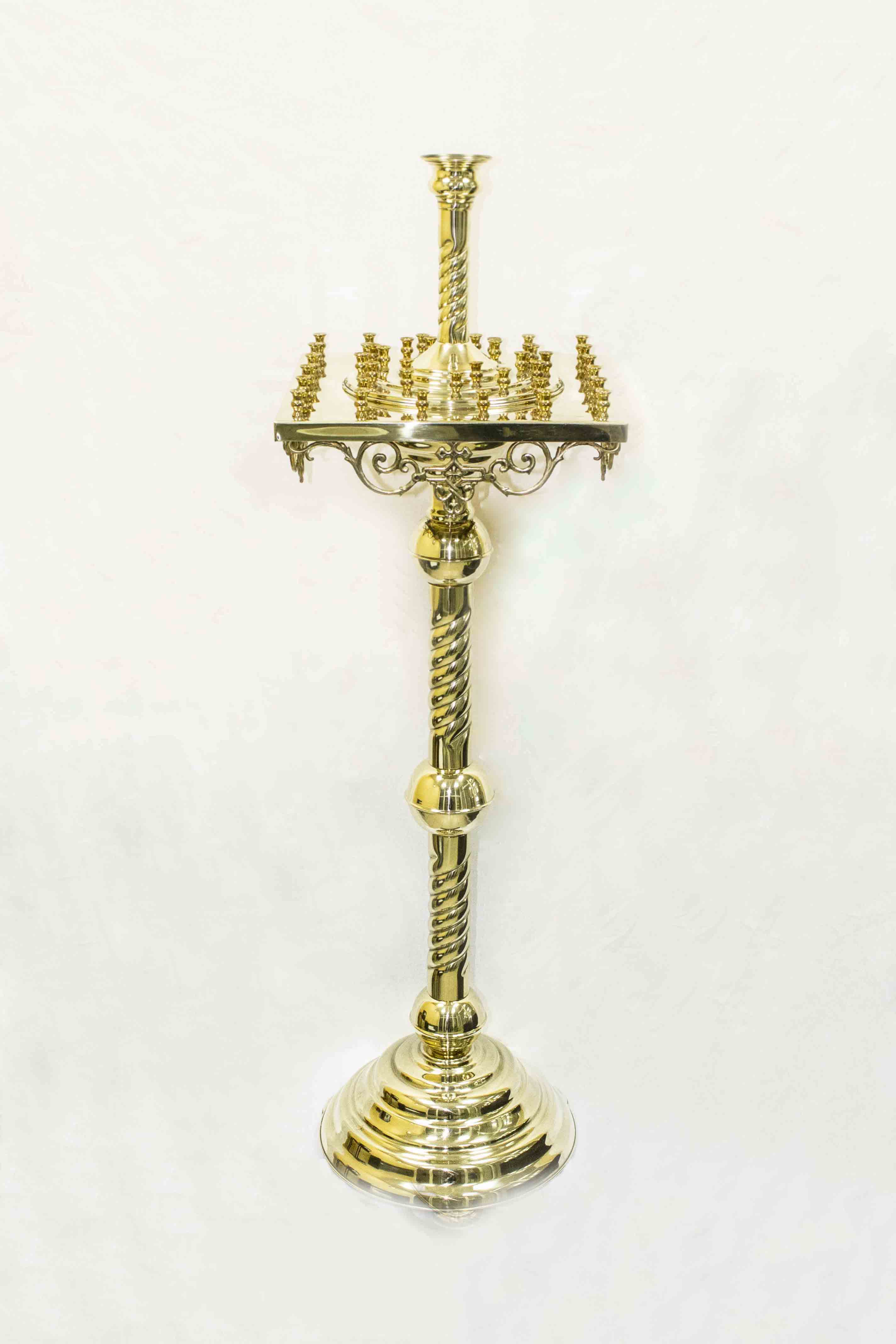 Производственные мастерские «Колокол» предлагают латунный подсвечник с квадртной крышкой, с лампадкой на 42 свечи. Качественный сплав меди-цинка обладает отменными эстетическими и эксплуатационными характеристиками. Безупречный вид изделия, выполненного на декоративно-витой опоре («ноге»), не только исполнит роль функциональной подставки для свеч, но станет украшением храма. Высота изделия составляет 120 см, высота опоры - 85 см.