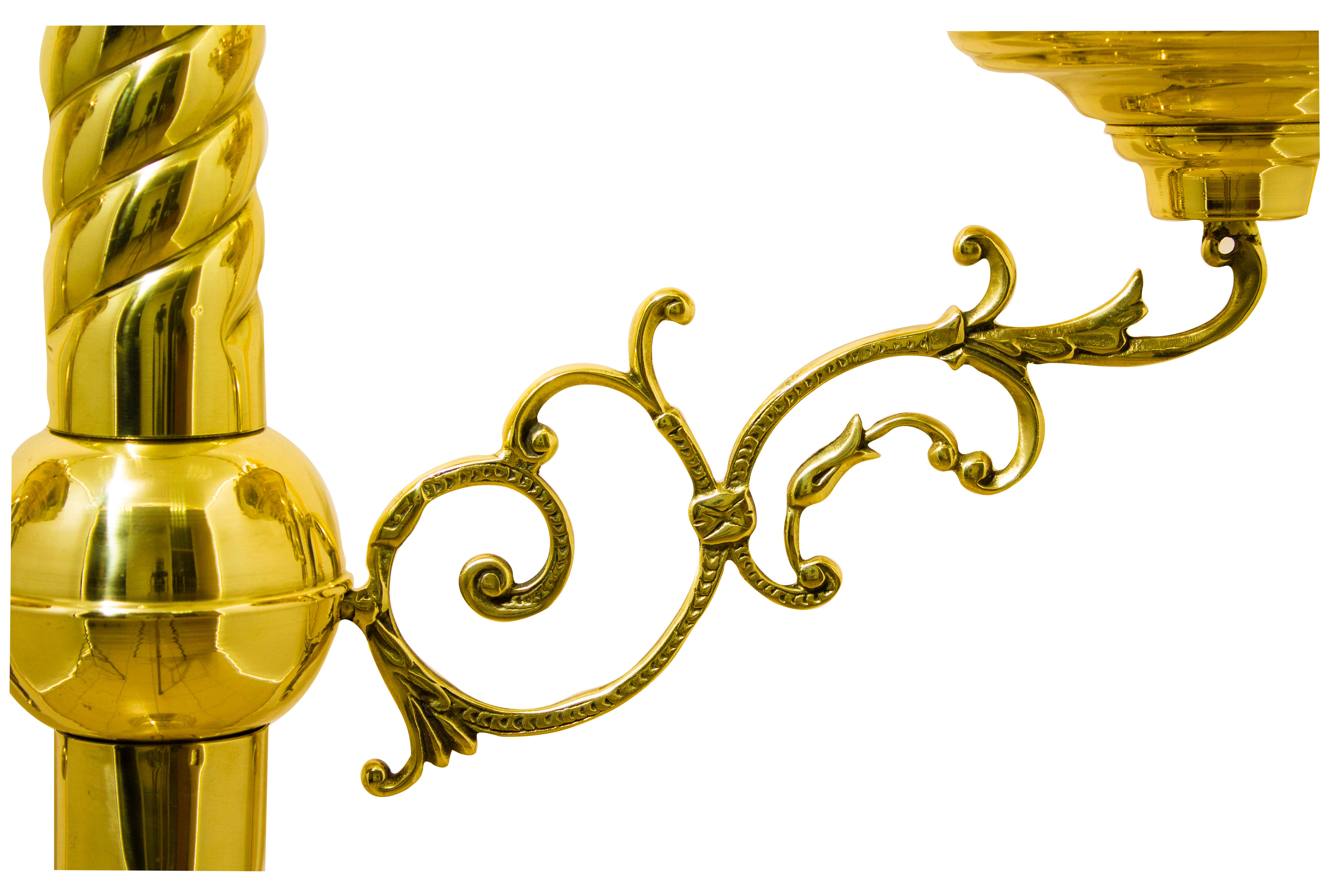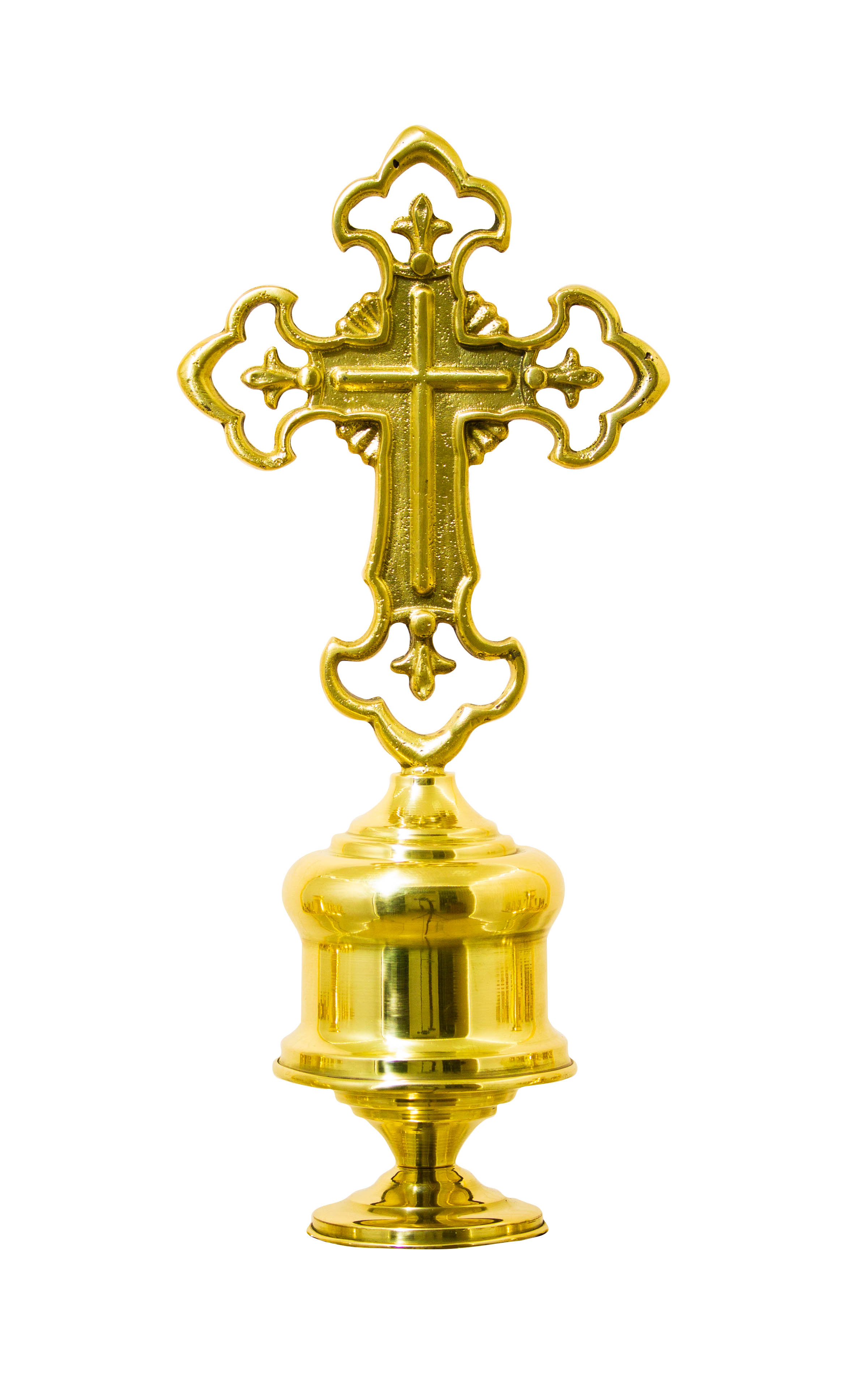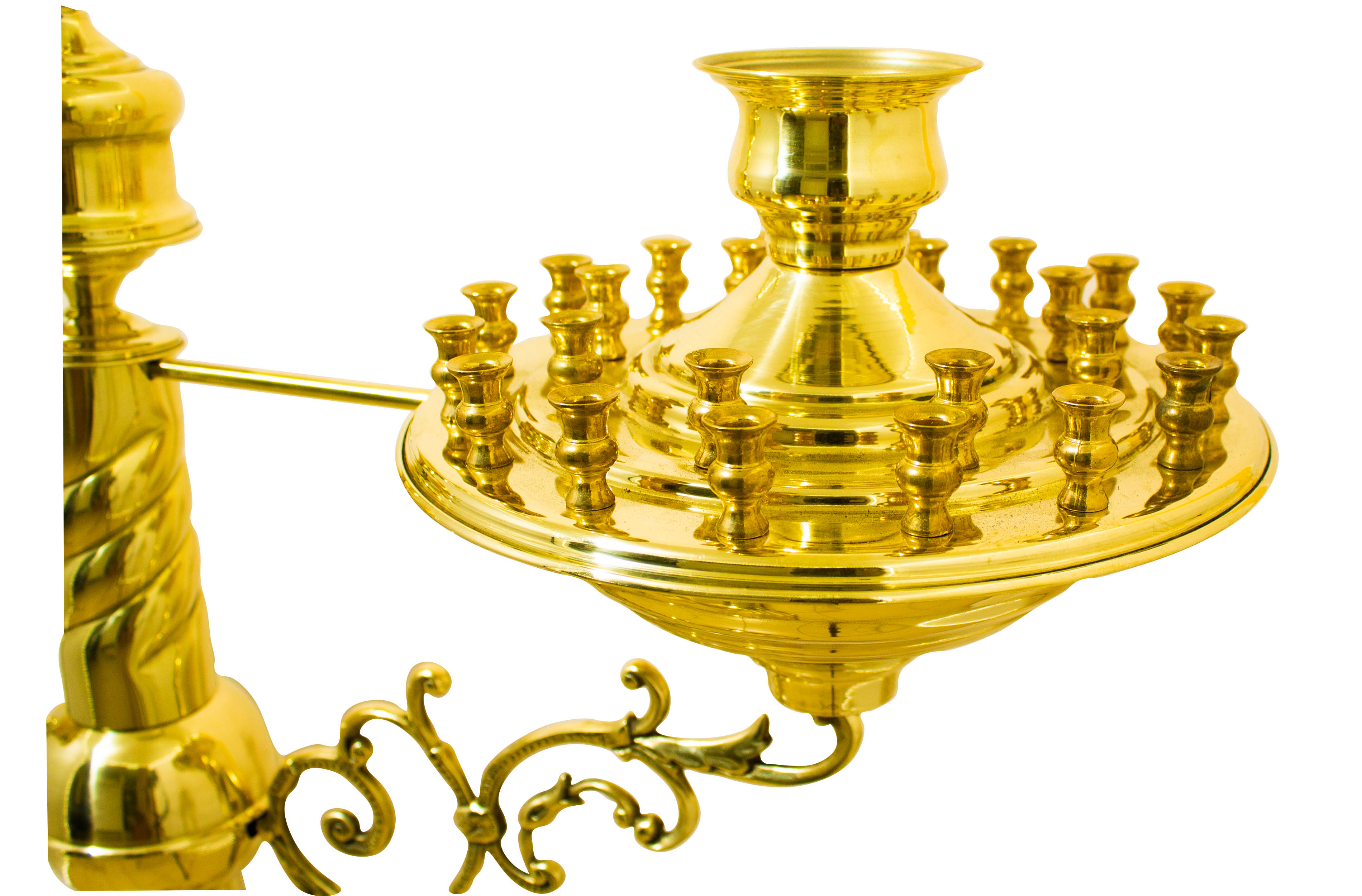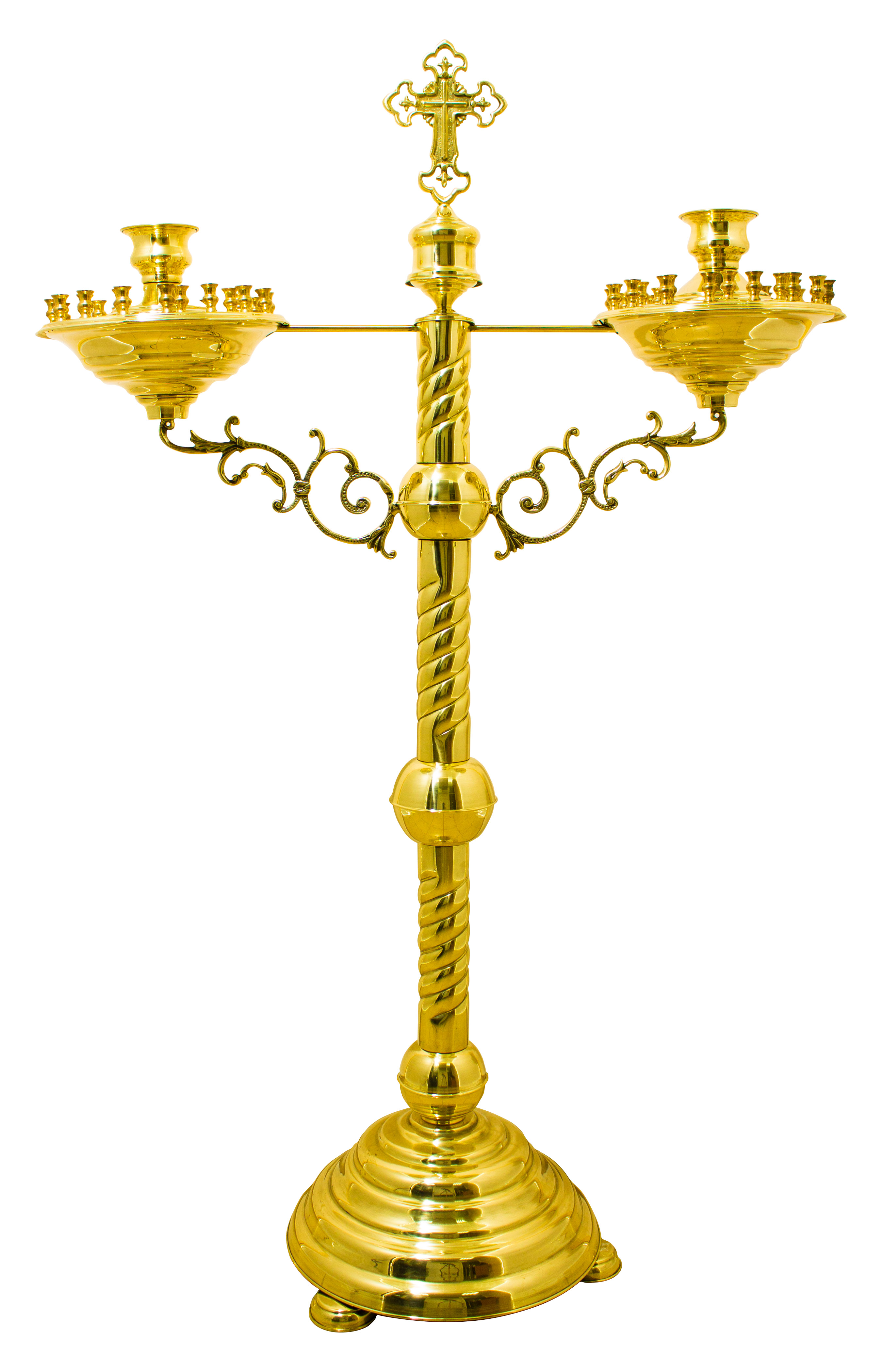 Производственные мастерские «Колокол» предлагают латунный подсвечник с двумя чашами на 24 свечи каждая. Качественный сплав меди-цинка обладает отменными эстетическими и эксплуатационными характеристиками. Безупречный вид изделия, выполненного на декоративно-витой опоре («ноге»), не только исполнит роль функциональной подставки для свеч, но станет украшением храма. Высота изделия составляет 134 см, высота до подлампадника - 117 см, верхний диаметр каждой чаши 30 см, нижний - 35 см.