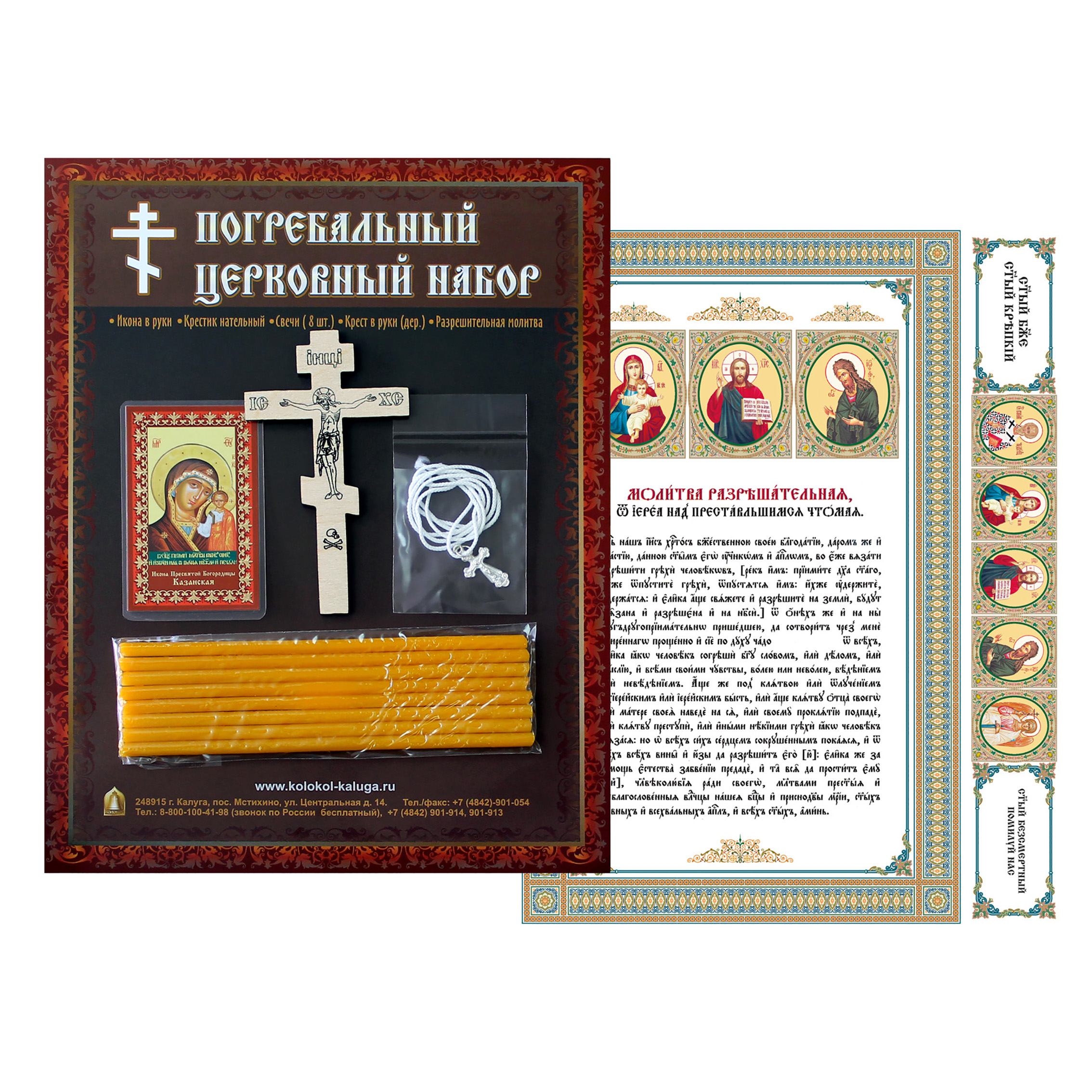 Казанская икона Божией Матери - особо почитаемая православными христианами чудотворная икона Богородицы. Молитвы перед образом Казанской иконы Божией Матери помогут найти душевное утешение и спокойствие в момент тяжелой утраты. В наборе также содержится 8 свечей, зажигающиеся во время прощания, крест и молитва, которые кладутся в руки усопшего. Икона же помещается на лоб усопшего.