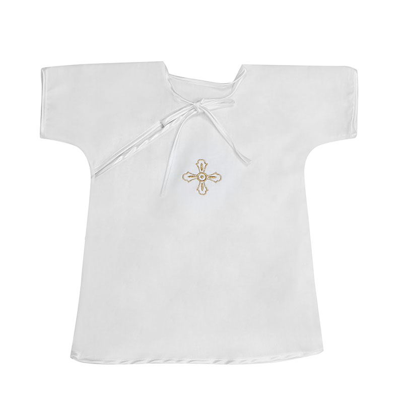 Крестильная рубашка для 1-2 года предназначена для принятия Таинства ребенком до 2 лет. Классическая свободная сорочка из бязи белого цвета со свободным воротником и атласными завязками будет прекрасным подарком крестнице или крестнику. В центре, на груди, золотом вышит христианский крест. После Крещения рубашку берегут как святыню всю жизнь.