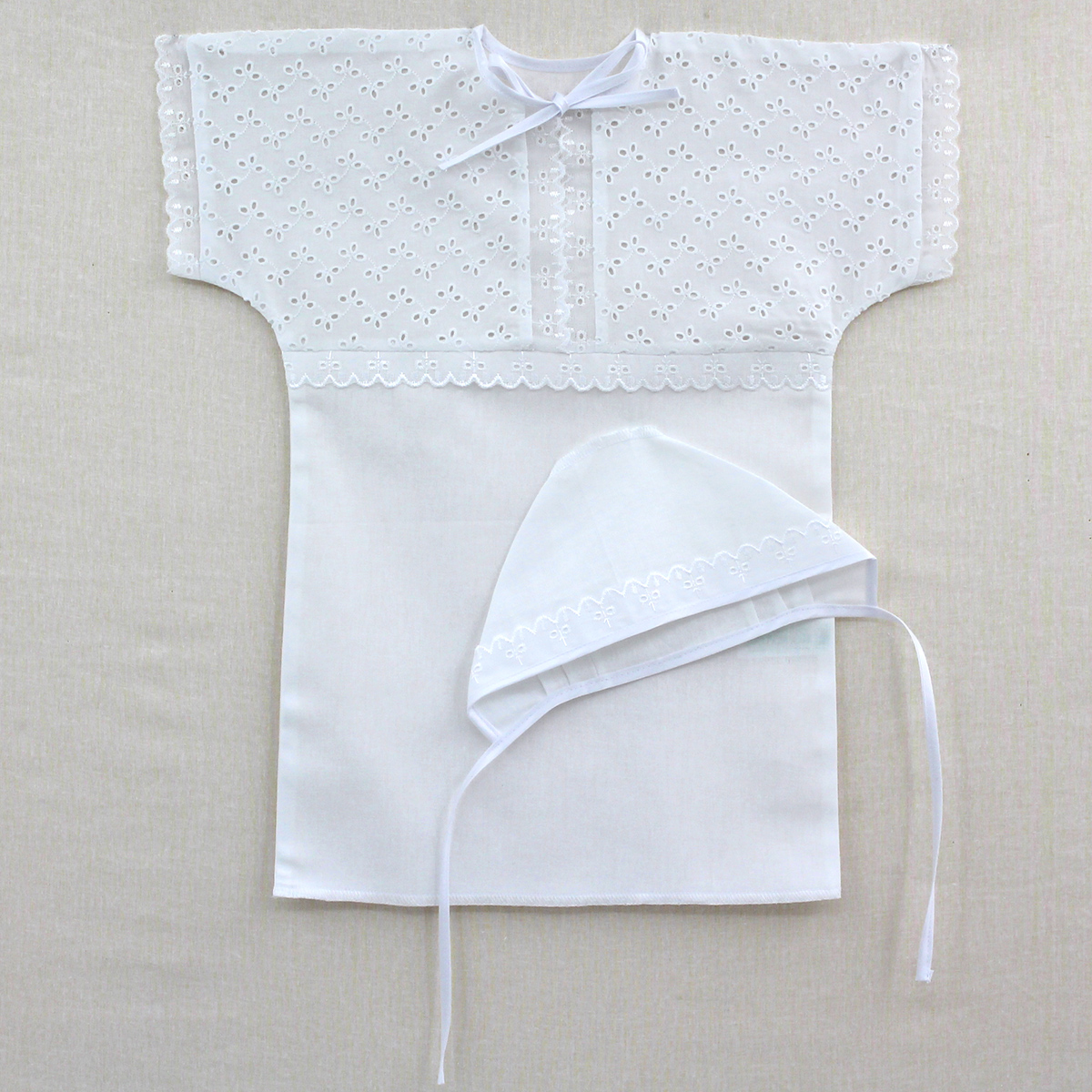 Рубашка крестильная до 1 года + чепчик , отделка шитьём - белая К