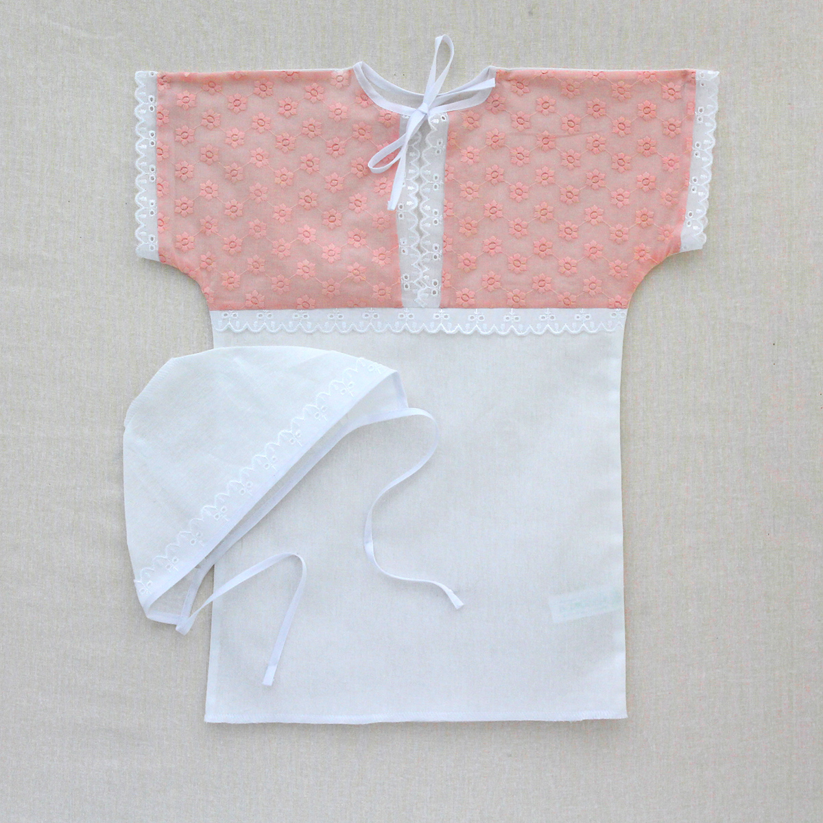Рубашка крестильная до 1 года + чепчик , отделка шитьём для девочек - розовая К