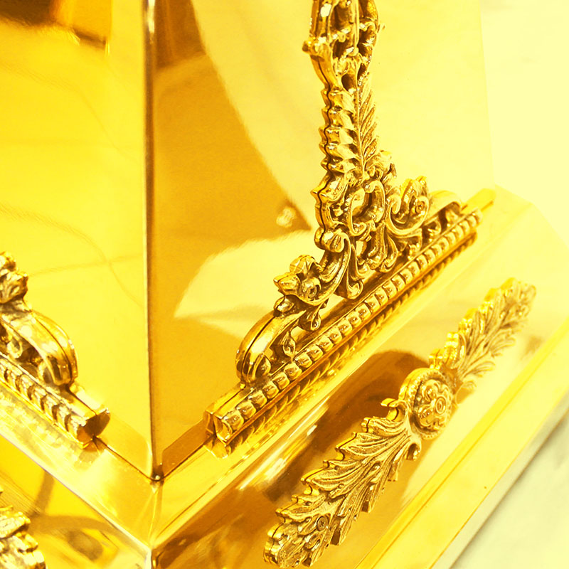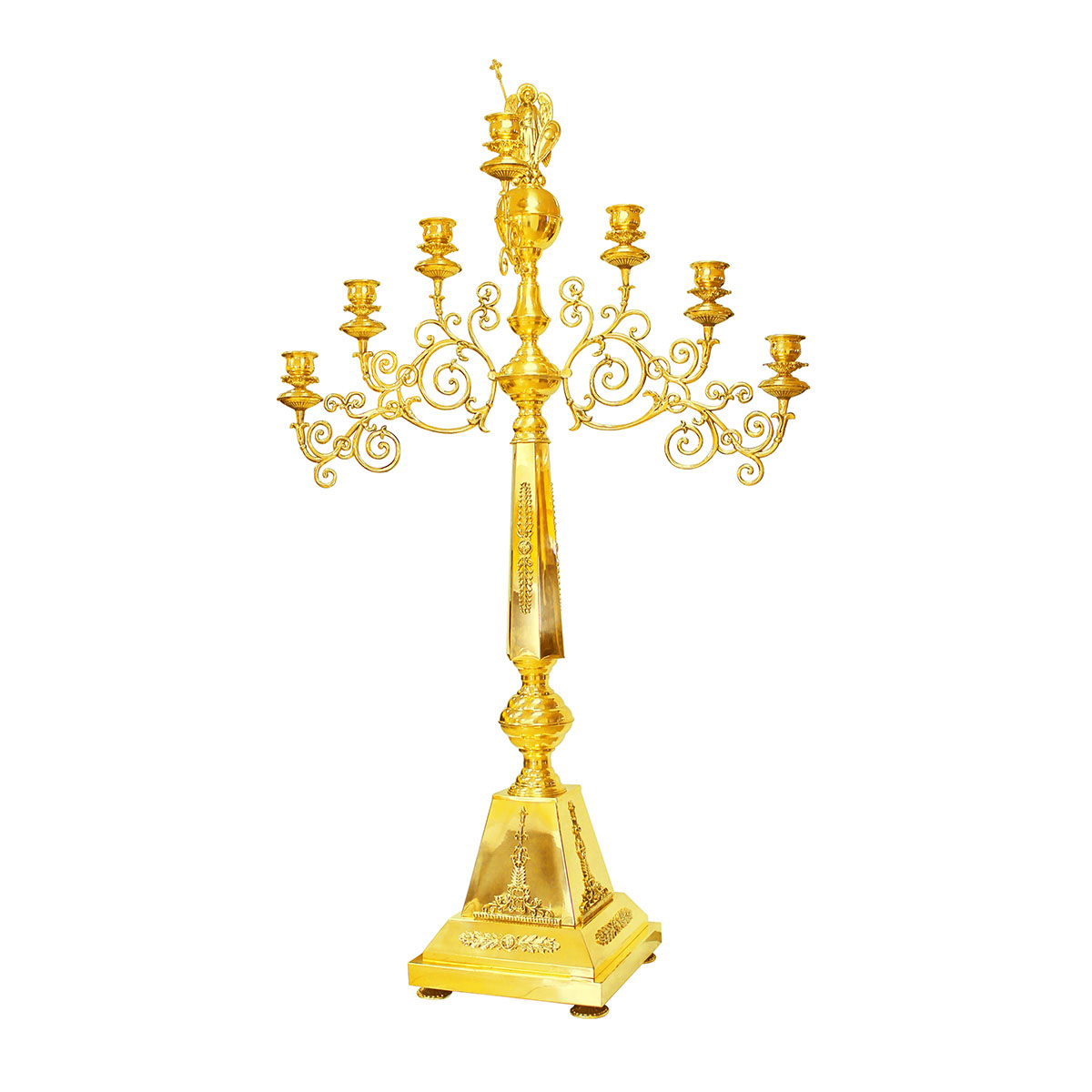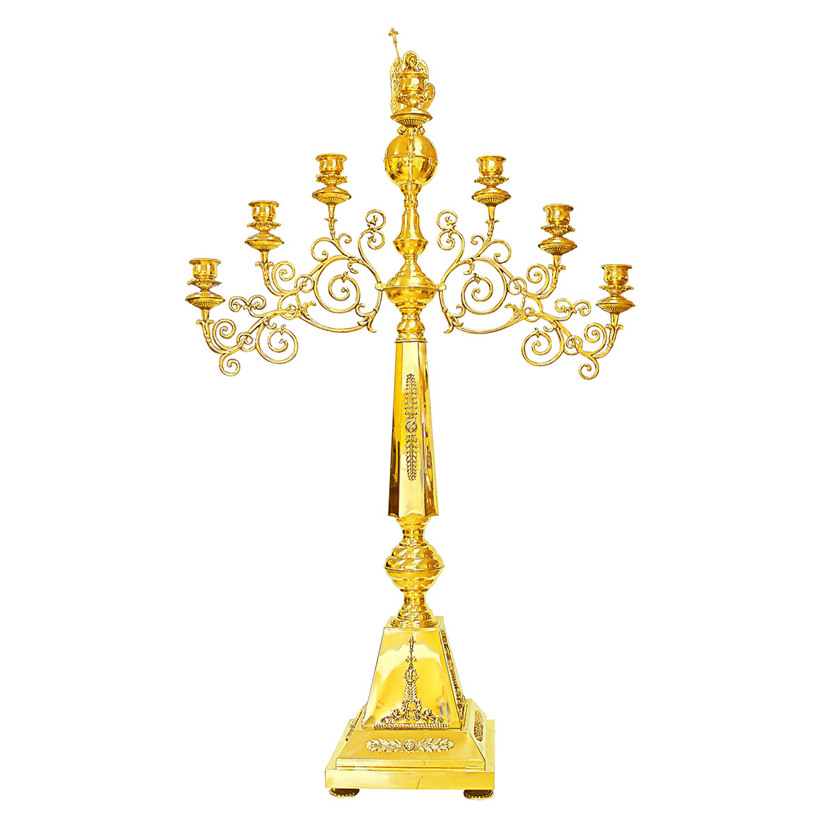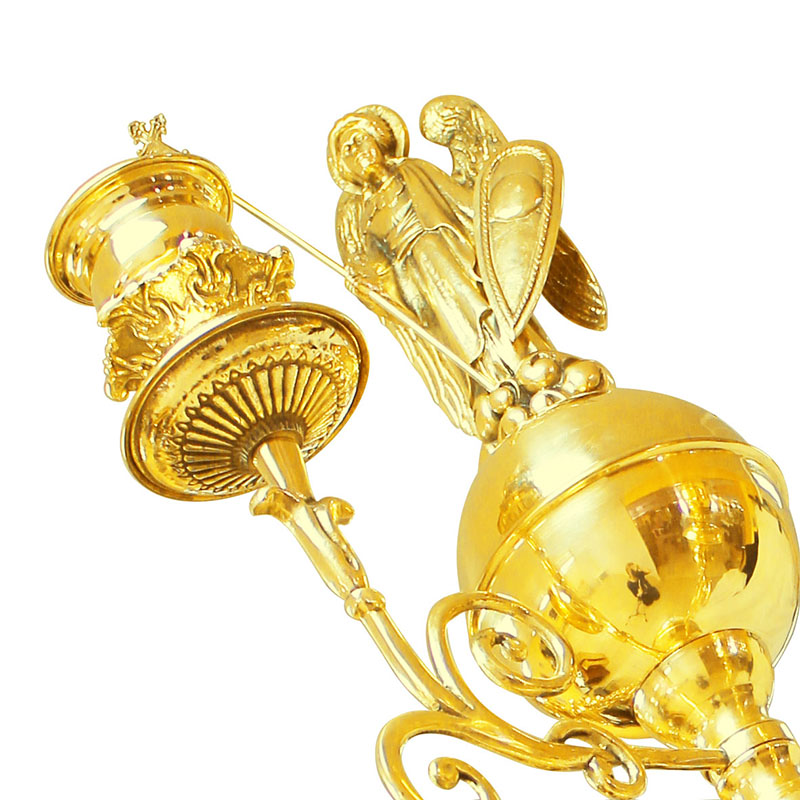 Во времена христианства семь огоньков церковного светильника обретает новый смысл, символизируя семь Даров Духа Святого и семь церковных главных Таинств. Мастерские «Колокол» изготавливают семисвечники различных видов и форм. Предлагаемый большой запрестольный семисвечник на одном основании выполнен из латунного сплава, золотой архангел украшает вершину изделия, а его семь лампадных чашечек расположены на богато декорированных ажурных рожках. Больше различной церковной утвари вы найдете в нашем интернет-магазине.