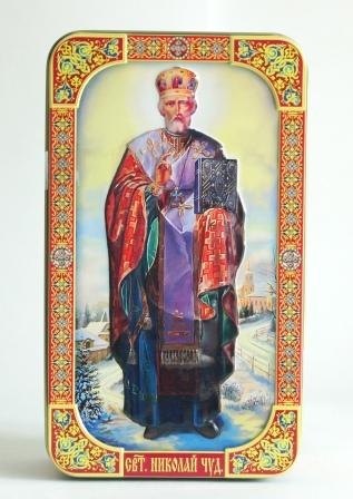 Шкатулка подарочная 100 г Николай Чудотворец с магнитом (черный цейлонский чай) ж/б
