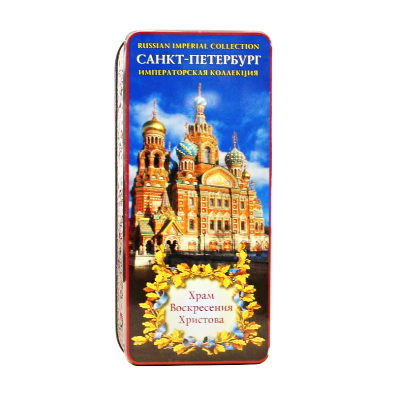 Шкатулка подарочная 100гр "Храм Воскрессения Христова" с маг. (черн. цейлон. чай 50гр.ОРА, 50 гр.РЕКОЕ)ж/б
