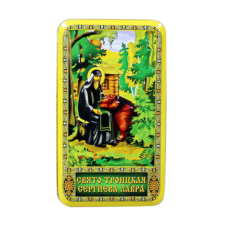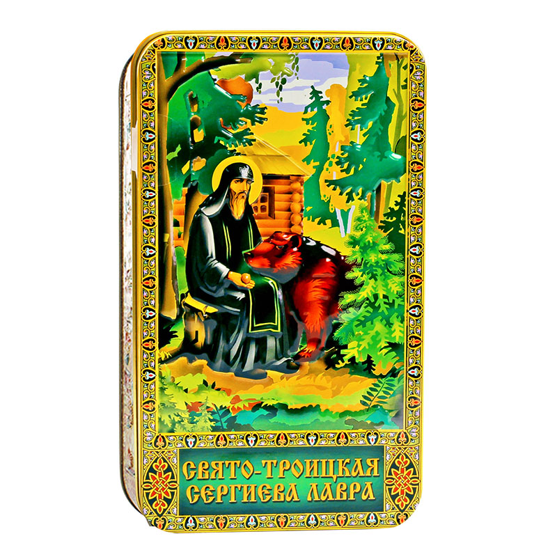 Шкатулка подарочная 100 г Сергий Радонежский и медведь (черный цейлонский чай ст. ОРА) ж/б