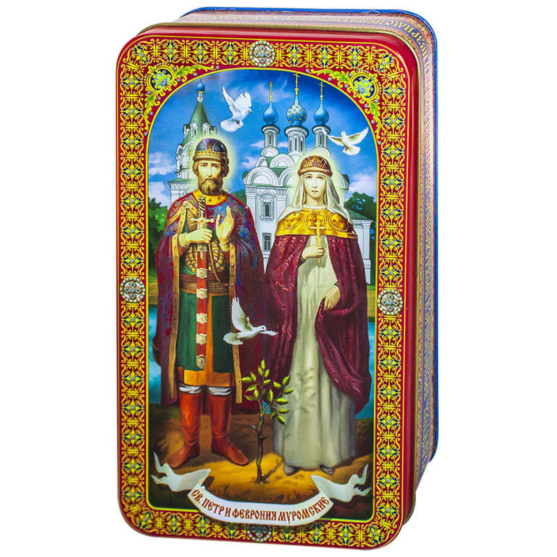 Шкатулка подарочная 100 г Свв. Петр и Феврония (черный цейлонский чай ст. JBOP) ж/б