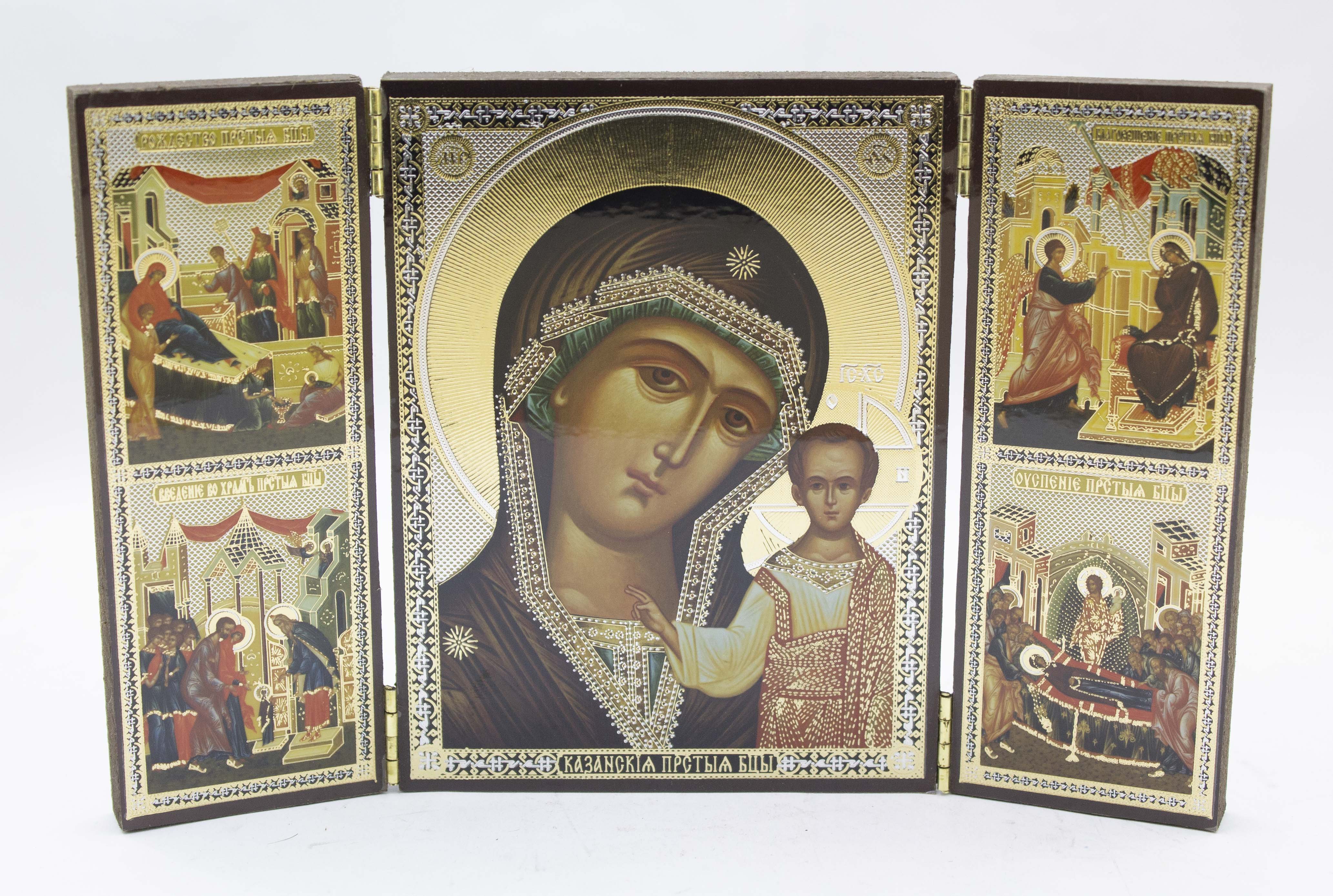Складень деревянный тройной большой Казанская Б.М. (с праздниками) (180*116) 001
